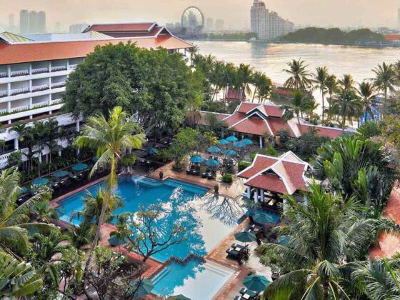 Anantara Riverside — The Anantara Riverside resort on the west bank of the Chao Praya River is an oasis in the concrete jungle of Bangkok. Its enormous pool has ample umbrellas, shaded trees, and a swim-up bar, making it the perfect place to cool down. The resort has several on-site restaurants, a nightly dinner cruise, and a Thai cooking school. Although the hotel is a little secluded, it offers a free shuttle boat to the Asiatique night market and the Taksin Bridge metro station, allowing easy access to the city.