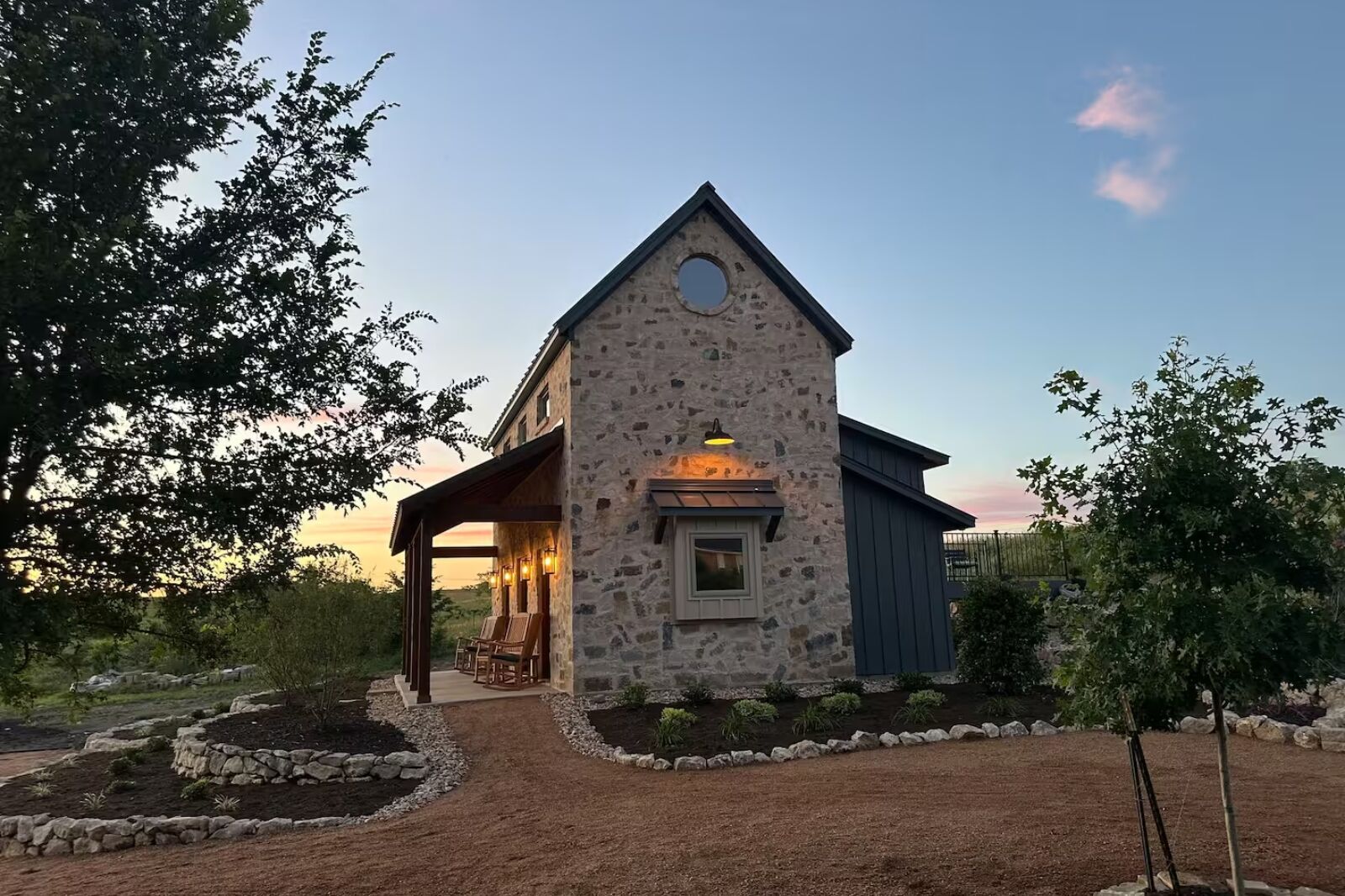 Farmhouse-style guest cottage in southwest Fort Worth — Set on a gated property in southwest Fort Worth, this newly built guesthouse takes its cues from an 1800s Texas farmhouse, with a lofted queen bed, rocking chairs on the front porch, and a deck that leads to a firepit. The main level has a full kitchen, a pantry with a coffee bar, and a living area with a sleeper sofa, while the separate washer and dryer and walk-in shower make longer stays convenient. The setting is quiet and residential but still practical for exploring: Sundance Square, the zoo, TCU, and Clearfork are all within a short drive, and grocery stores and dining are close by.