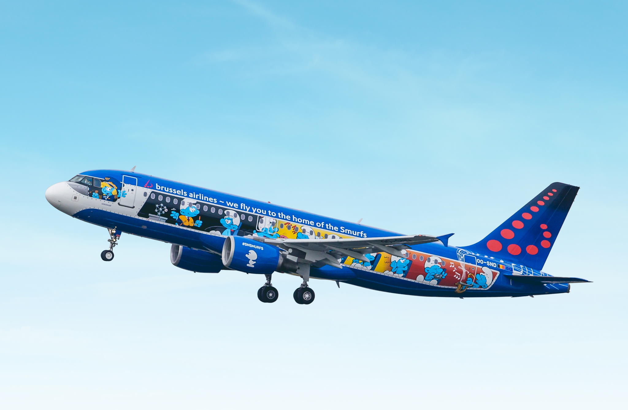 Brussel Airlines has five special airplanes in its fleet which all wear cool, Belgian-culture-focused liveries, but the newest of them is also one of the coolest, outside and inside. Peyo, the cartoonist who created the iconic Smurfs, was Belgian, so Brussel Airlines is paying tribute to him and his 14th Smurf Album The Aerosmurf by flying a Smurf-themed aircraft. The livery is incredibly fun, with smurfs covering just about every surface of the fuselage (with Smurfette and Papa Smurf acting as pilots) and Gargamel and Azrael making an appearance on the belly of the airplane. Inside, everything is about the cute blue characters, too. The seats are Papa Smurf-colored, the carpet has some Smurf prints leading all the way down the aisle, there are some cool decals that looks like a panel from The Aerosmurf album, and there are Smurf movies and music played on board.
