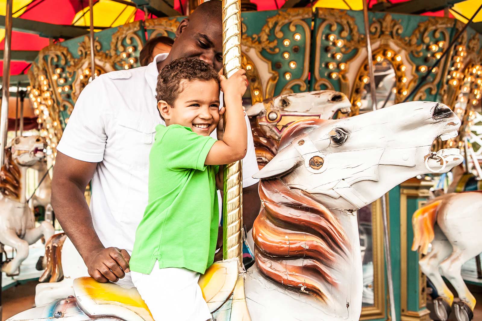 Afterward, hop off the train and onto a waterless Wave Runner, ride the antique carousel, and take a cruise on the mini Ferris wheel. There’s plenty of green space to explore, and evenings usually mean softball games, skate park action, or joining in on the basketball and tennis courts.