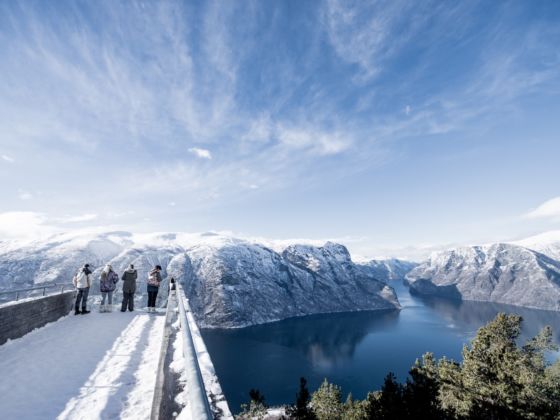 Sure, you could walk up to the clearly Scandinavian-designed viewpoint (it’s curved, wooden, and see-through) from the nearby parking lot, float yourself over the edge of the fjord, and call it there — it’d still be one hell of a day — but the Aurlandsfjord deserves to be seen from more than one vantage point. It’s arguably better from your own little patch of snow, no sign of other sightseers in sight.