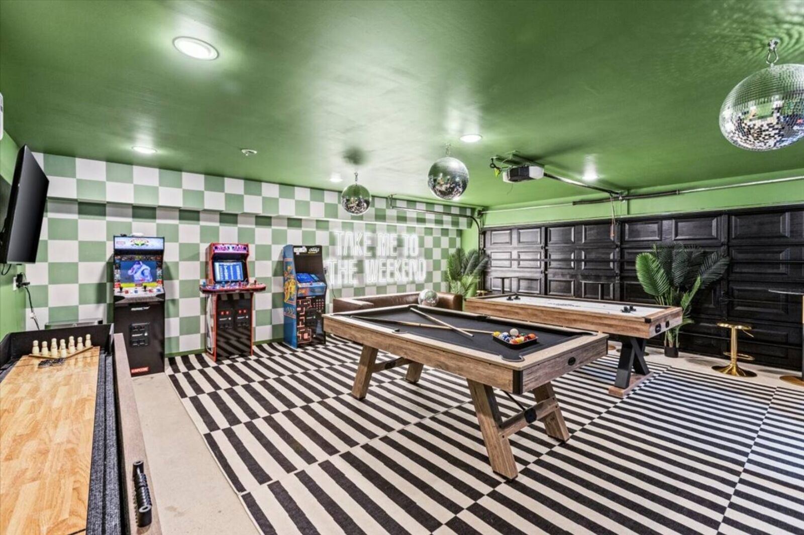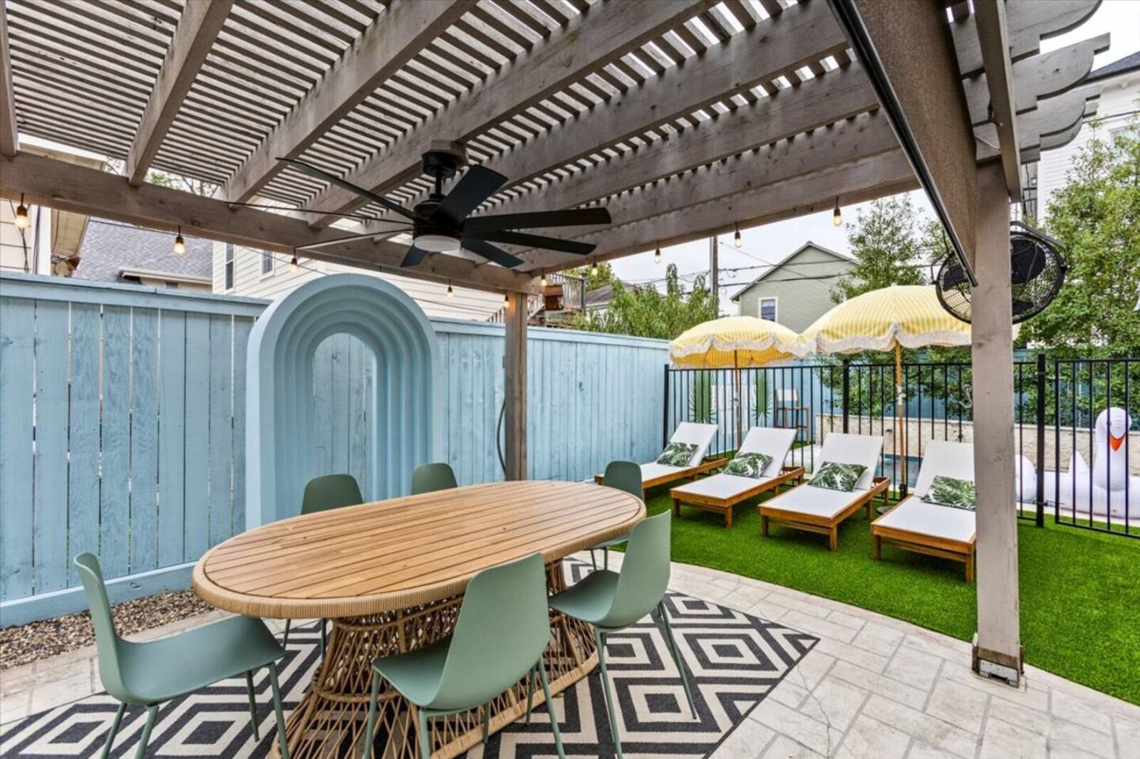 This three-bedroom Heights home goes all out with Palm Springs colors, from the turquoise pool fence to the striped patio loungers and the speakeasy-style arcade hidden behind the garage door. The main house sleeps six, with two king bedrooms and a queen, while the garage apartment has bunks that can work for extra friends or late arrivals. Out back, you’ll find a heated pool, mini golf, and oversized yard games and indoors you’ll find air hockey, shuffleboard, and classic arcade games. The location is a few blocks from White Oak’s cafes and bars, and about a 15-minute drive to downtown and the stadium.