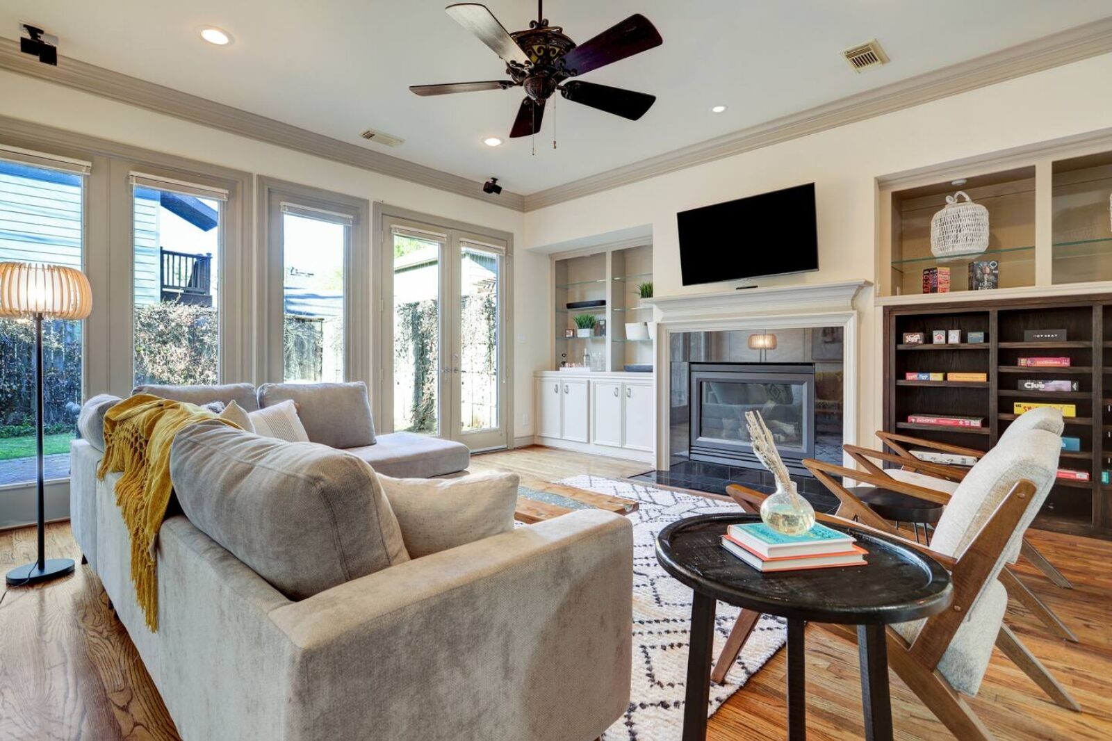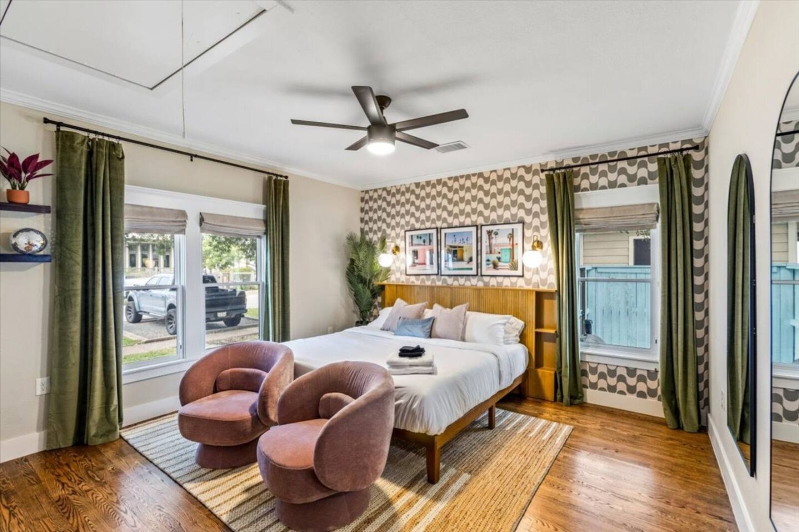 This four-bedroom house sits about 10 minutes from downtown Houston and within 20 minutes of most spots in the city. The main house and a detached garage apartment are set up for short or longer stays. Interiors feel bright and heritage-inspired, with tall double-hung windows, tufted seating, and reclaimed wood floors that nod to the neighborhood’s history. Each bedroom has its own character, including a primary suite with a king bed and a bathroom with a soaking tub, and there’s plenty of space for kids or extra guests between the twin bunk beds and queen bed in the additional rooms. You can roll open the doors to the patio and have dinner under a canopy of string lights or fire up the grill if you’d rather stay in. A bike and hike trail sits a block away, and when you’re ready to head farther afield, quick freeway access puts you near the Galleria, the Energy Corridor, and the stadiums.