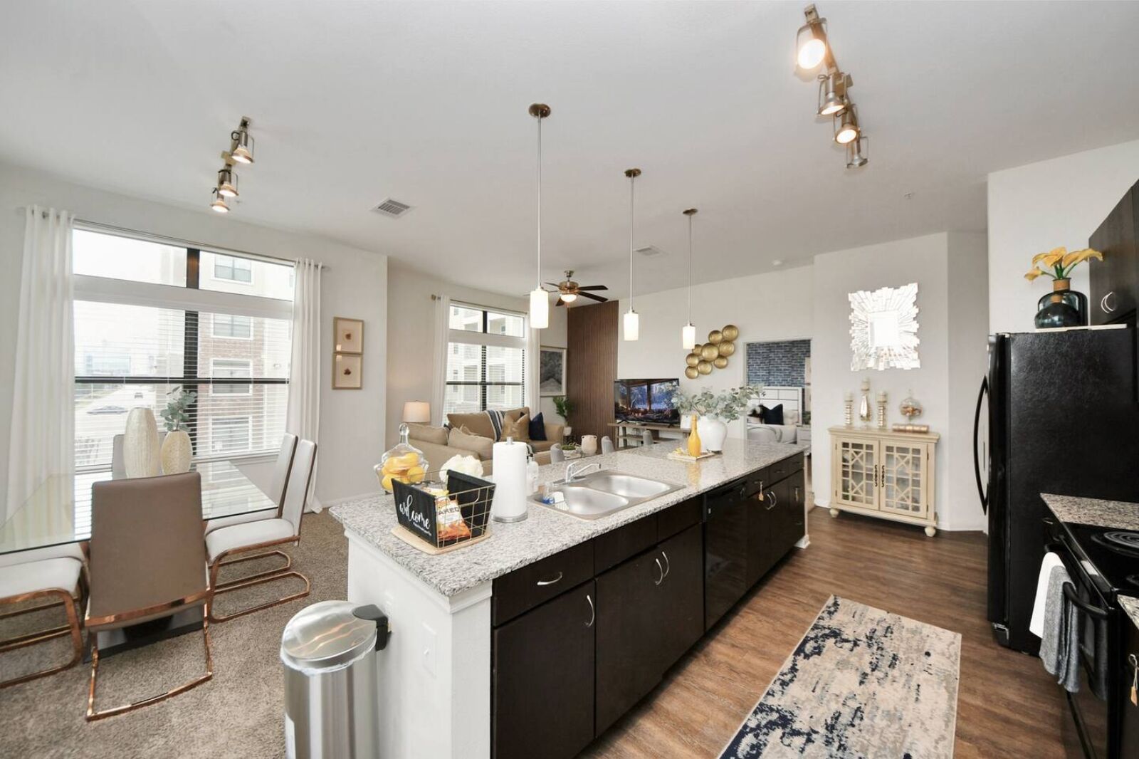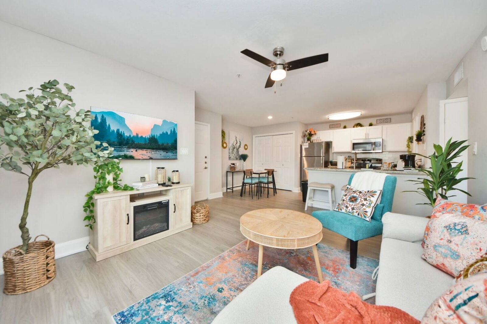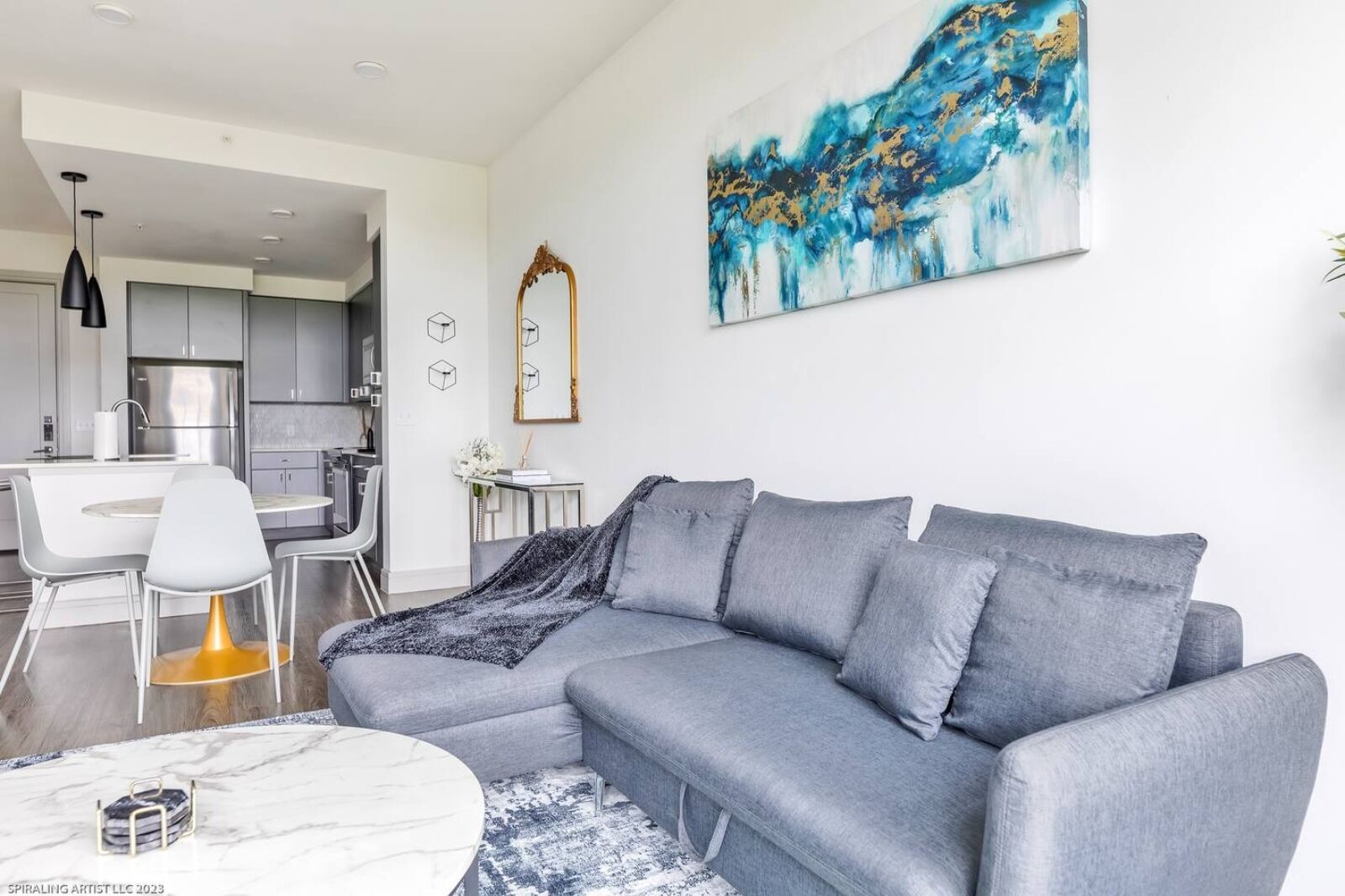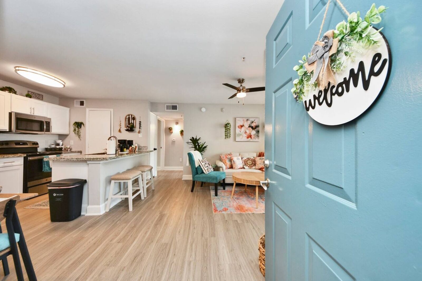 This modern, rustic mid-rise apartment sits less than a mile from NRG Stadium and about 10 minutes from downtown Houston. You can cook in the chef’s kitchen, complete with stainless steel appliances, an island for extra prep space, and a separate dining area. From there, the open floor plan leads into the living room, where large windows fill the space with natural light and the couch pulls out into a sleeper sofa. The primary bedroom has a king-size bed, and the second bedroom a queen. There’s a private patio and you’ll also have access to the complex’s shared amenities, including a business center, pool, and gym.