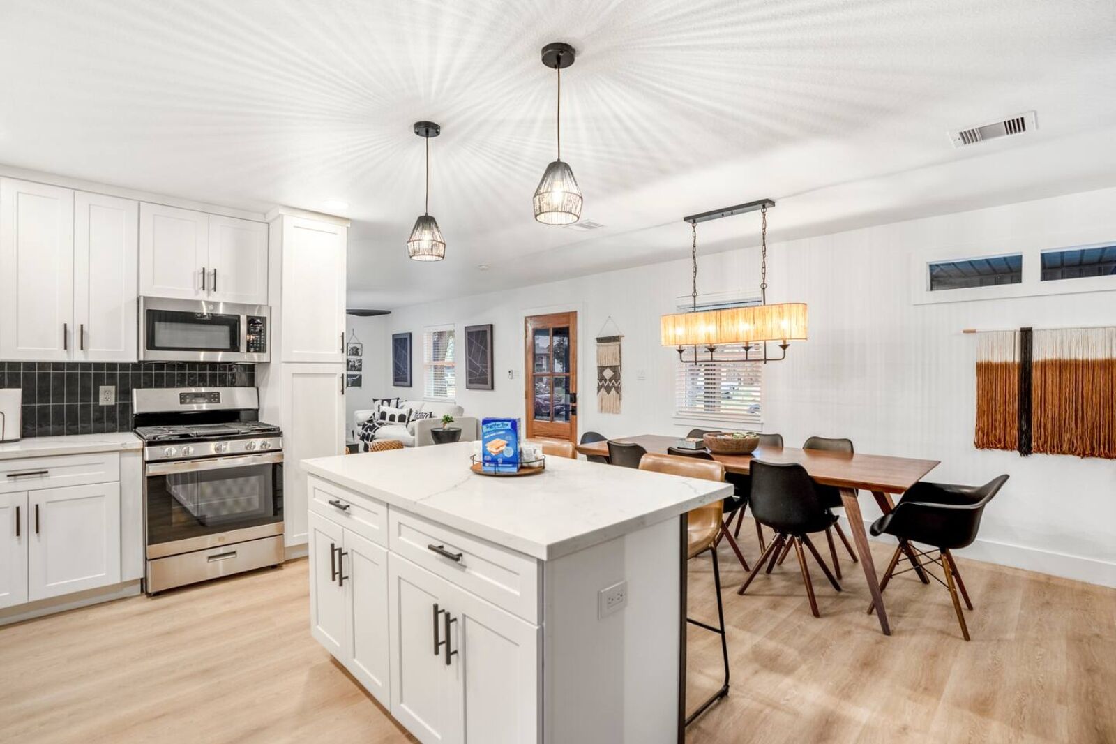 A recently renovated four-bedroom, three-bathroom house in a quiet Houston neighborhood, this Airbnb puts you within an easy drive of downtown while offering plenty of space for groups or families. A dedicated game room has a pool table and a mix of board games, and the living area includes a 70-inch TV with a soundbar. The kitchen is outfitted with bright white cabinets, modern appliances, and a Keurig, plus a separate dining room with a table for six. The primary bedroom has a king-size bed, while a second room offers two twin bunk beds and one full-size bunk. A third bedroom has a full-size bed, and a fourth includes a queen-size bed. High ceilings and minimalist design keep the space open and comfortable. Out back, there’s a grassy yard with a patio and seating area.