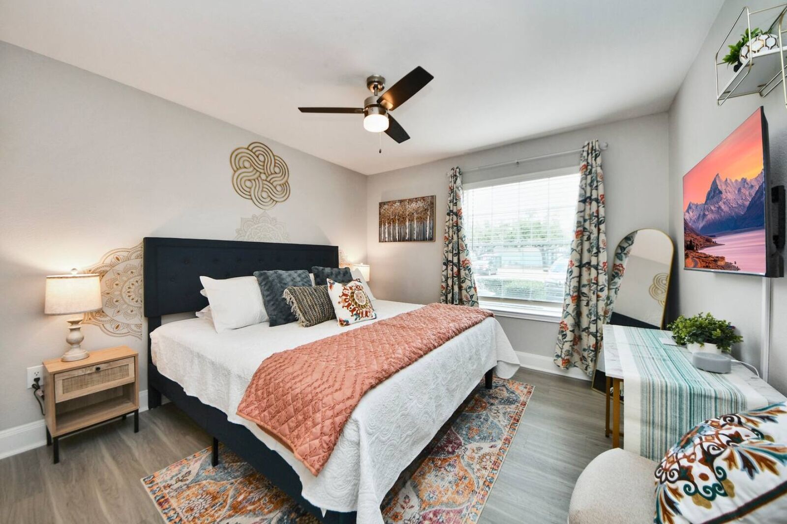 Simple, affordable, and modern, this one-bedroom is around a 25-minute walk from the stadium and offers a king-sized bed, blackout curtains, and a roomy living area. The rental includes access to reserved parking in a gated garage, plus access to a gym, pool, and shared lounge areas. Previous guests mention that check-in is quick and the apartment feels exactly as pictured, with many noting the spotless condition and easy communication with the host. You’ll be about 10–15 minutes by car from downtown restaurants and the Galleria, and close to Rice University and Hermann Park if you plan to see more of the city between matches.