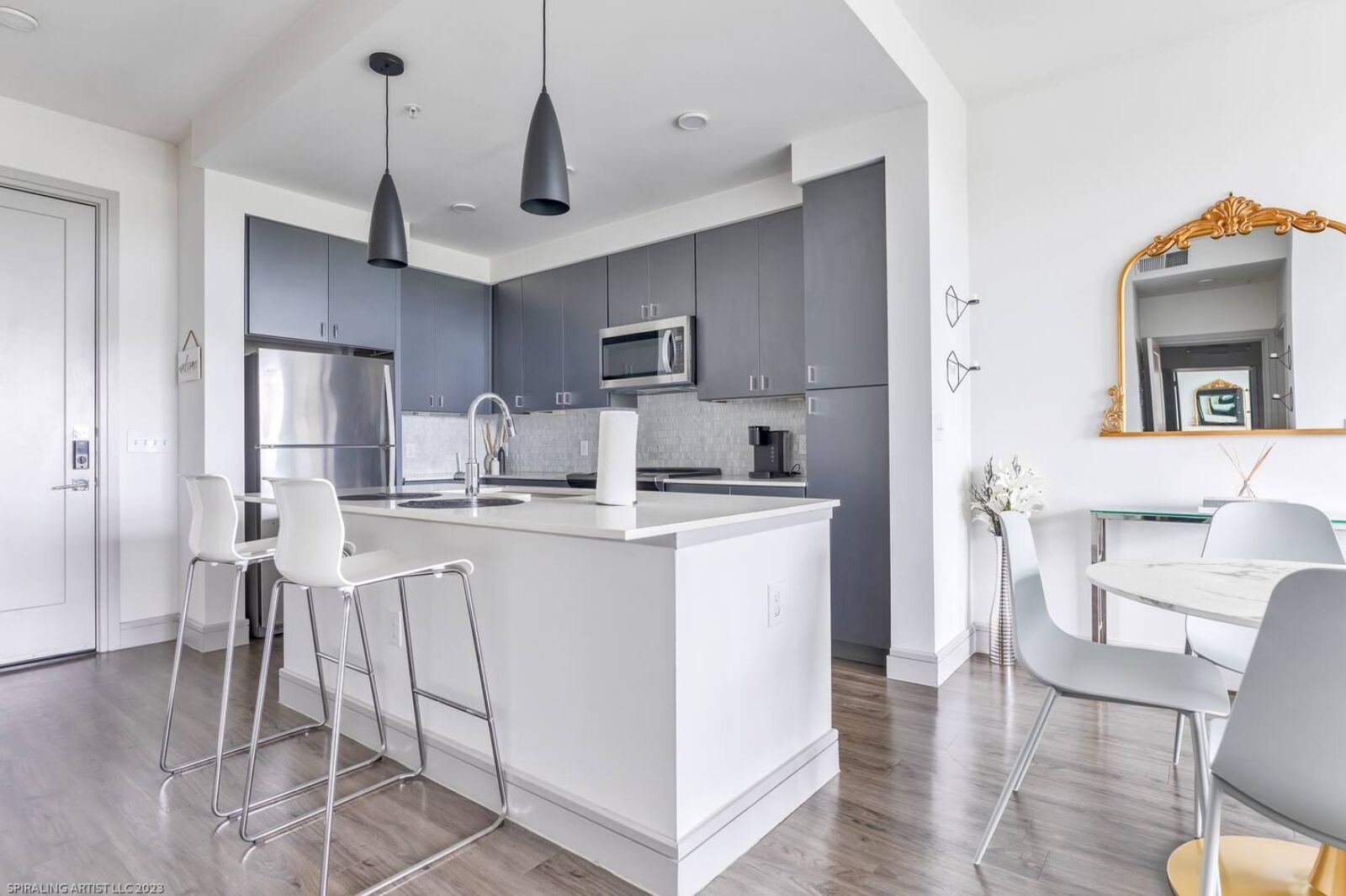 This East Downtown Houston property has three bedrooms and 3.5 bathrooms, each with a soaking tub. The interior combines natural materials and minimalist design, creating an inviting atmosphere throughout. In the living area, you’ll find an 85-inch smart TV, an electric fireplace, and plenty of space to relax. The primary bedroom includes a king-size bed and a walk-in closet, the second has a queen-size bed, and the third offers two full-size beds, with all bedrooms featuring en-suite bathrooms. The kitchen overlooks the city and is equipped with modern appliances for cooking, and out back, there’s a yard with a gas grill.