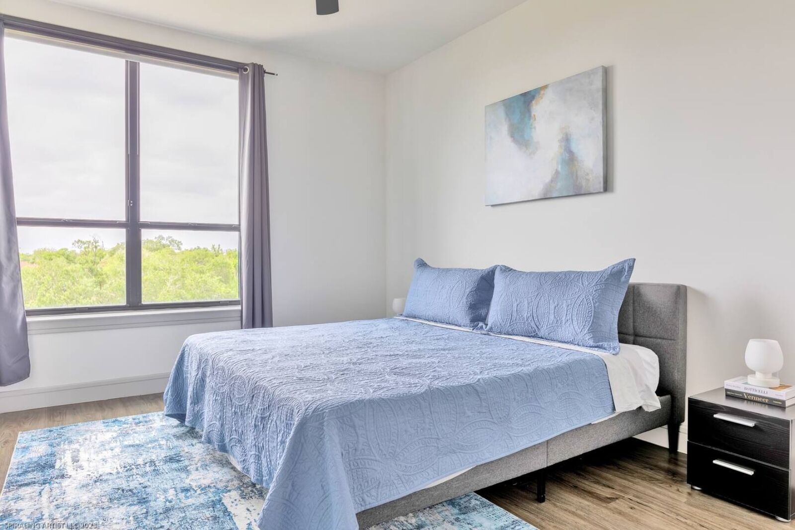 A contemporary three-bedroom home in Central Houston, this new build pairs smart technology with bright, comfortable spaces. Each bedroom has a private bathroom and memory foam mattresses. The primary suite features a king-size bed, walk-in closet, an attached bathroom with a soaking tub, and a large window framing downtown views and the two additional bedrooms each have a queen-size bed. In the living area, tan Italian leather couches face a 75-inch TV, and sliding doors open onto a balcony. The kitchen is stocked with essentials and fitted with sleek appliances, while wood floors and eclectic wall art create a warm, bohemian feel throughout the house.