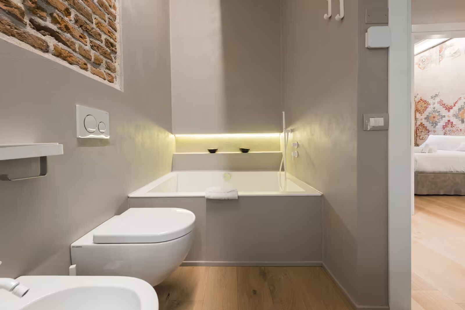 - Location: In Verona’s UNESCO-listed historic center, overlooking Piazza delle Erbe — the city’s medieval market square lined with cafés and Renaissance façades — and just a short walk from the Arena di Verona. The suite sits within Casa Mazzanti, a frescoed 15th-century palazzo that places guests right at the heart of the city’s cafés, market stalls, and nightlife.