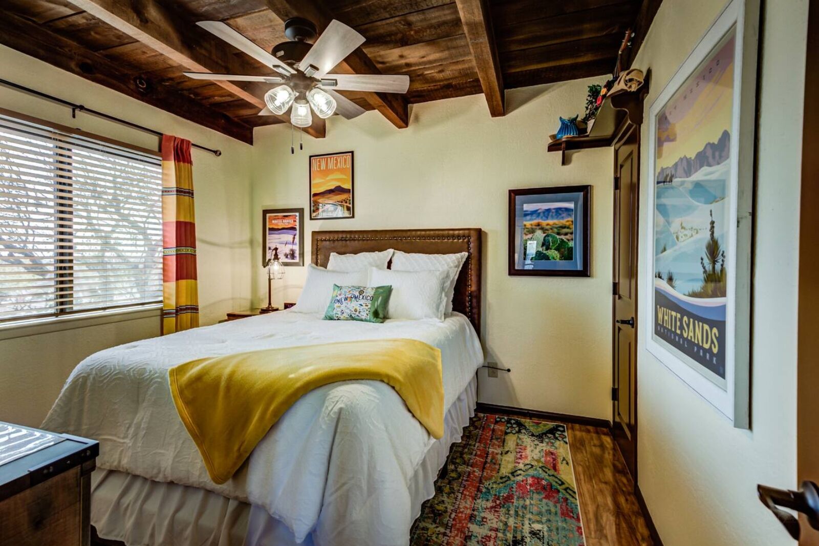 Ten minutes from the village of Ruidoso, this cute cottage is big on mountain charm. Spread over one level, the studio interiors are furnished with a king-size bed, gas fireplace, and sleek kitchen. Take a seat on the rocker on the deck and you can spend hours basking in the scenery of the forest. Just over an hour from the entrance, this is one of the best Airbnbs near White Sands National Park for couples or solo travelers.