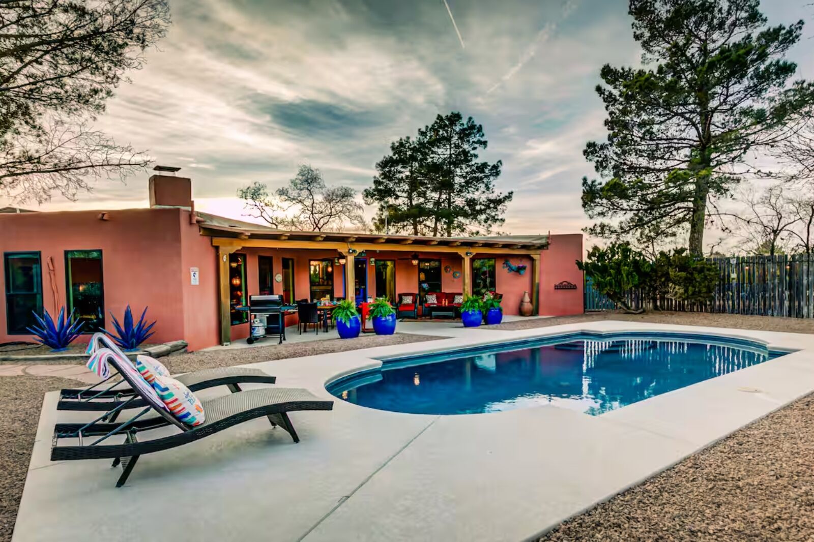 Wash off the crystals with a dip in your own private pool at this dog-friendly Airbnb on the outskirts of Las Cruces. Minutes from the Organ Mountains and less than an hour from White Sands National Park, the vacation rental has you covered for nature and downtown. The five-star property is decorated in the spirit of the Southwest with a kiva fireplace, soapstone countertops, and Saltillo tile work with artisanal handicrafts throughout. Complimentary sledding gear is provided.