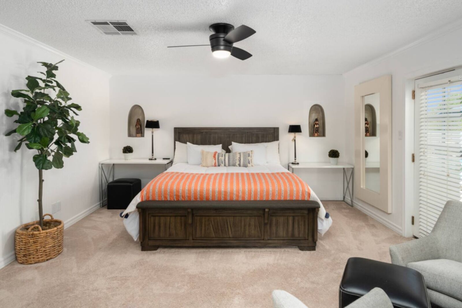 Just off Indian Wells Road, this pet-friendly rental is close to the conveniences of Alamogordo and an easy 20 minutes from White Sands. Tasteful decor is matched by thoughtful attention to modern amenities including a coffee station, fluffy towels, and nightstand lamps with built-in USB ports. In addition to the screened porch, the fully-fenced backyard has a grill and outdoor seating. Best of all, the lounge is your own home theater complete with leather recliners and a popcorn maker.