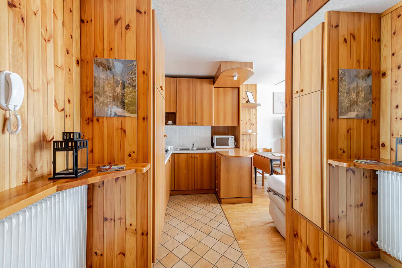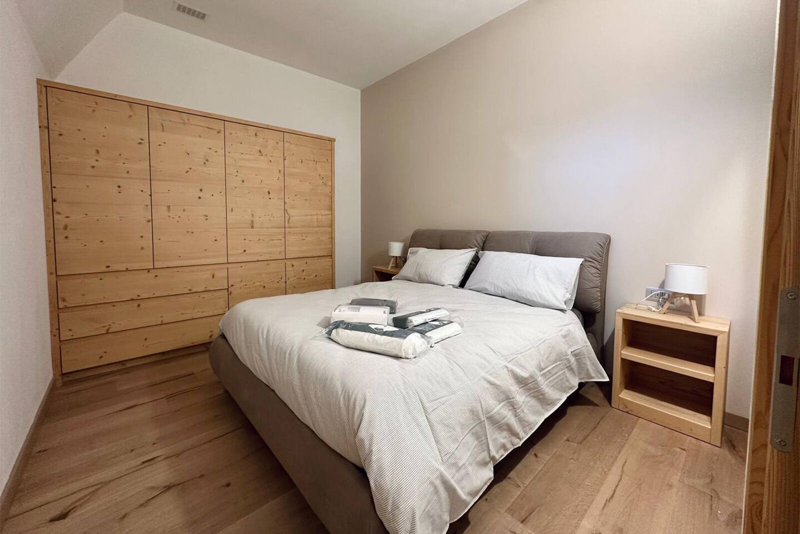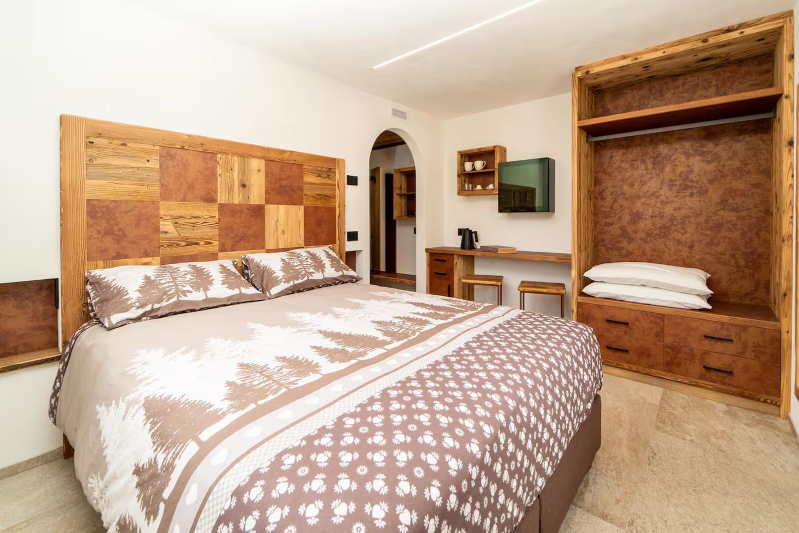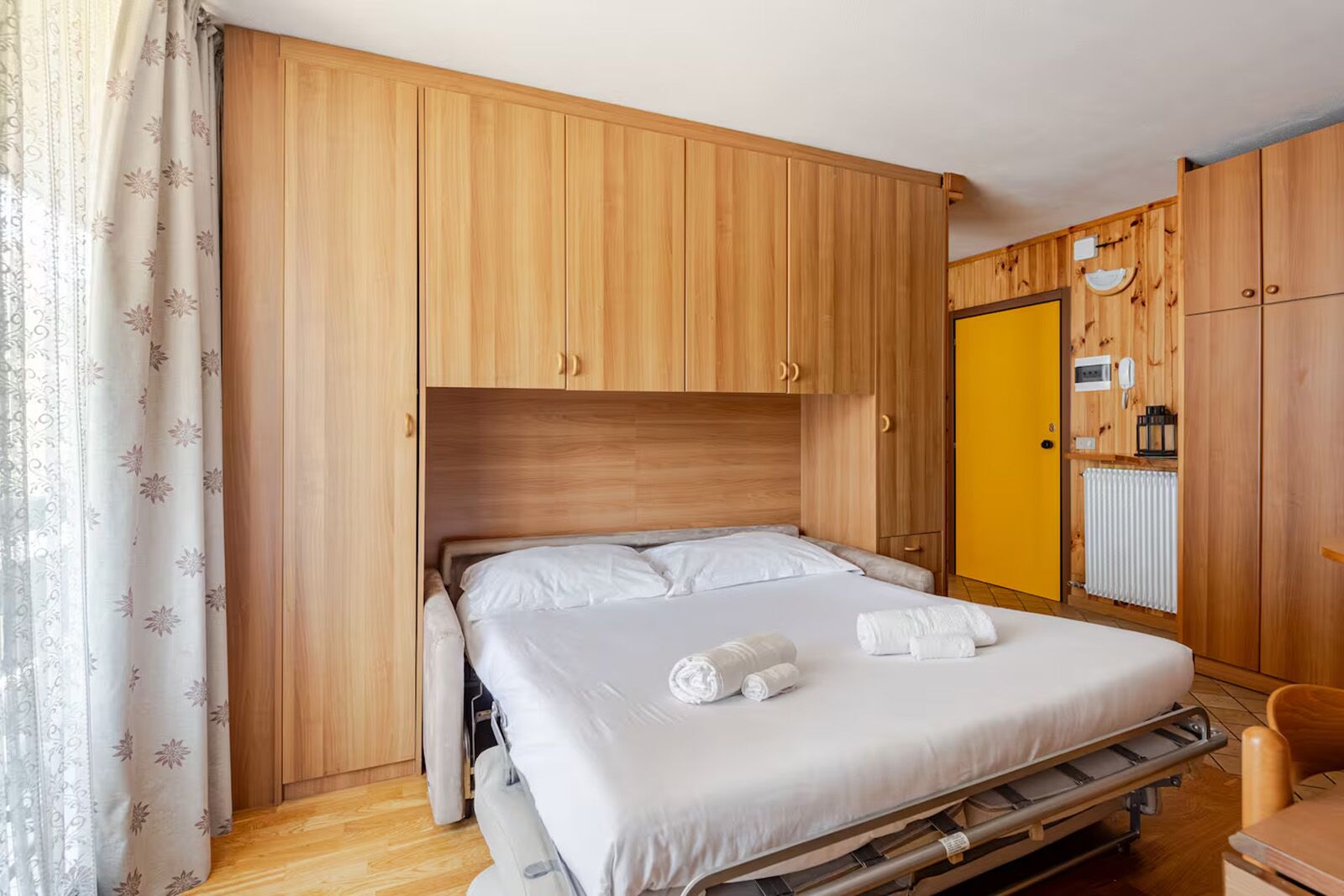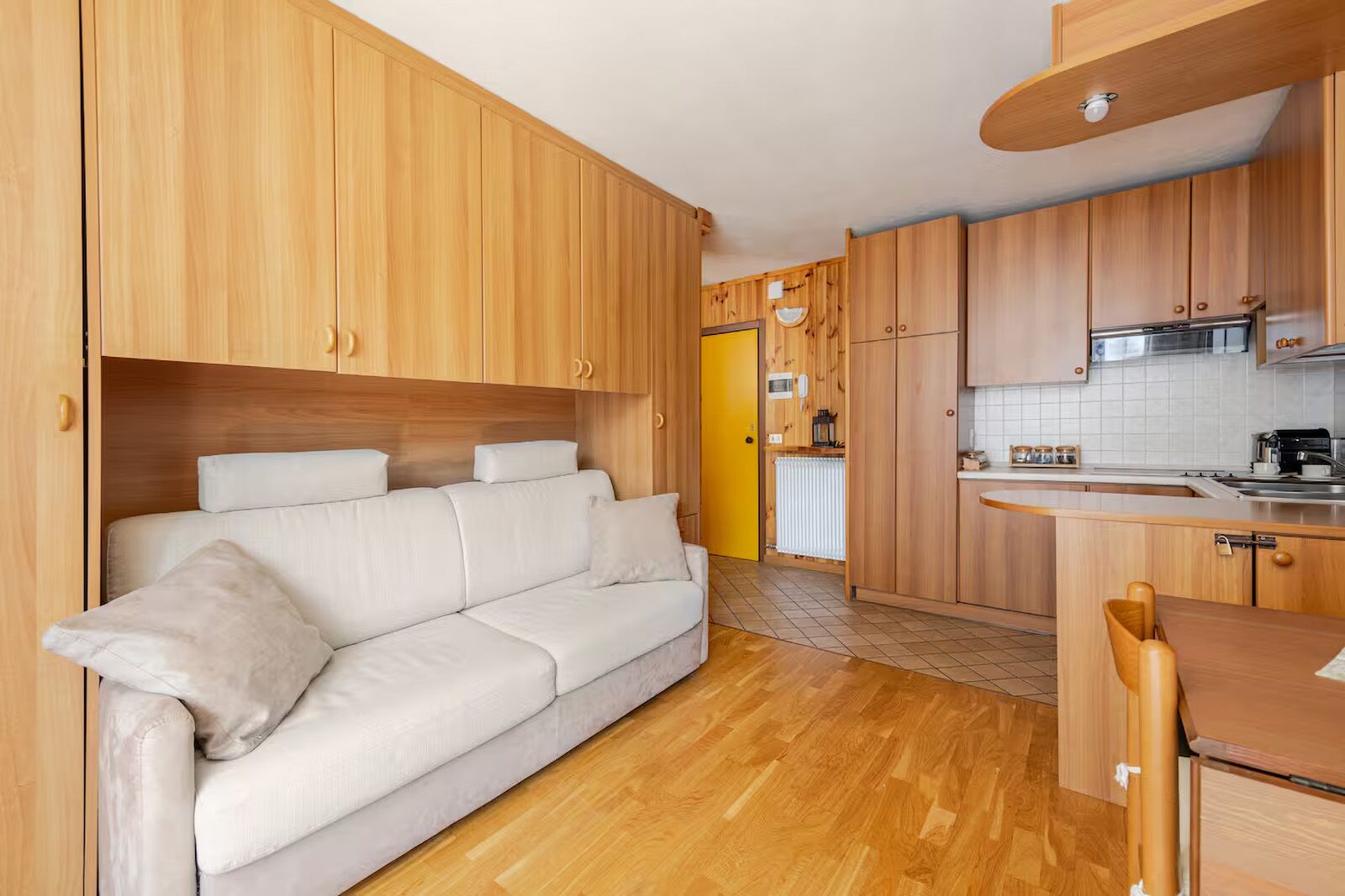 Bathed in natural light and furnished with fragrant pine carpentry, this one-bedroom rental is perfect for a couple traveling to Lombardy for a winter escape. It has a compact kitchen and a double bedroom opening onto a sunny balcony looking over the Italian Alps. The central location is favorable for getting to the venue, hitting the slopes, and indulging in après-ski at Bormio’s taverns.