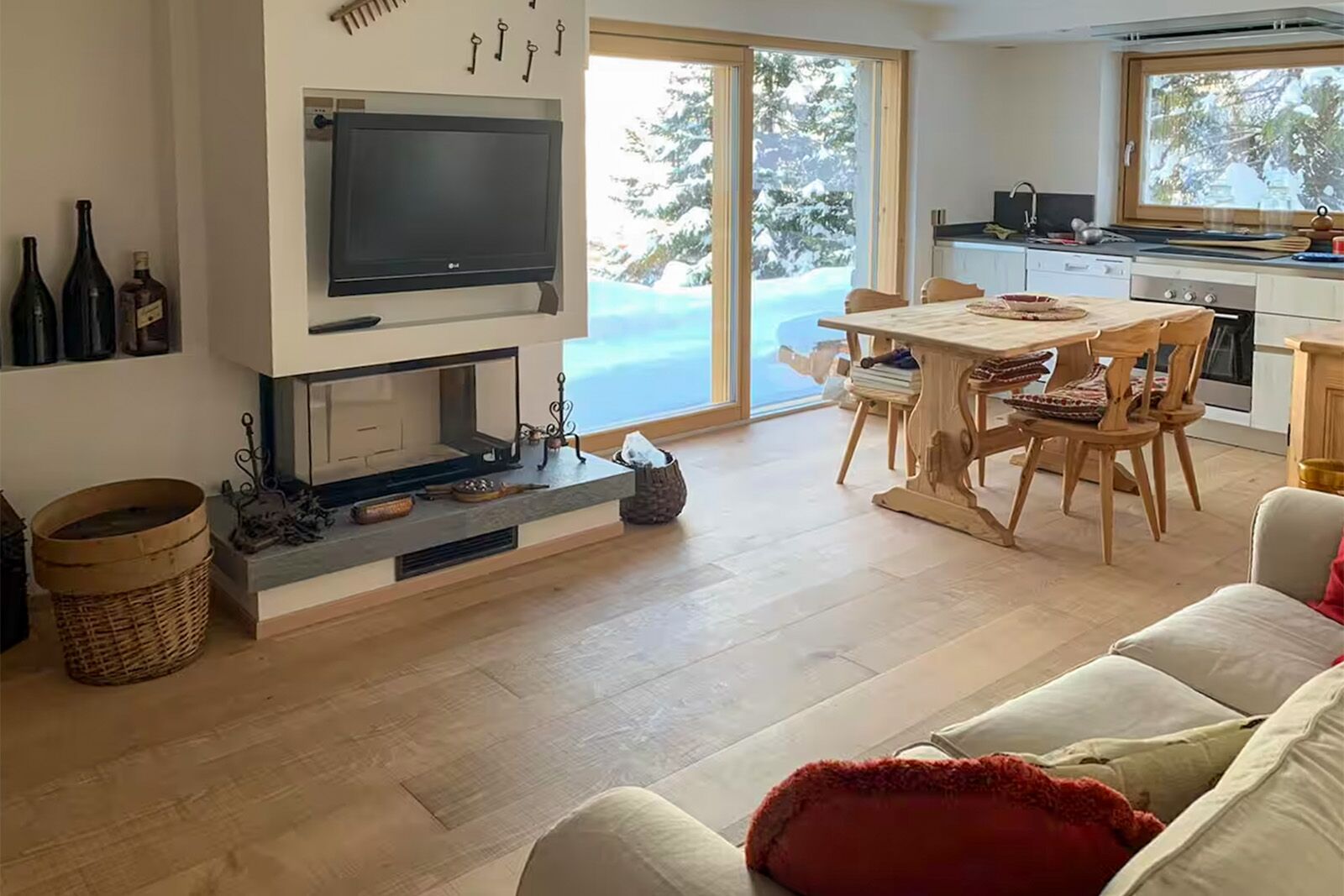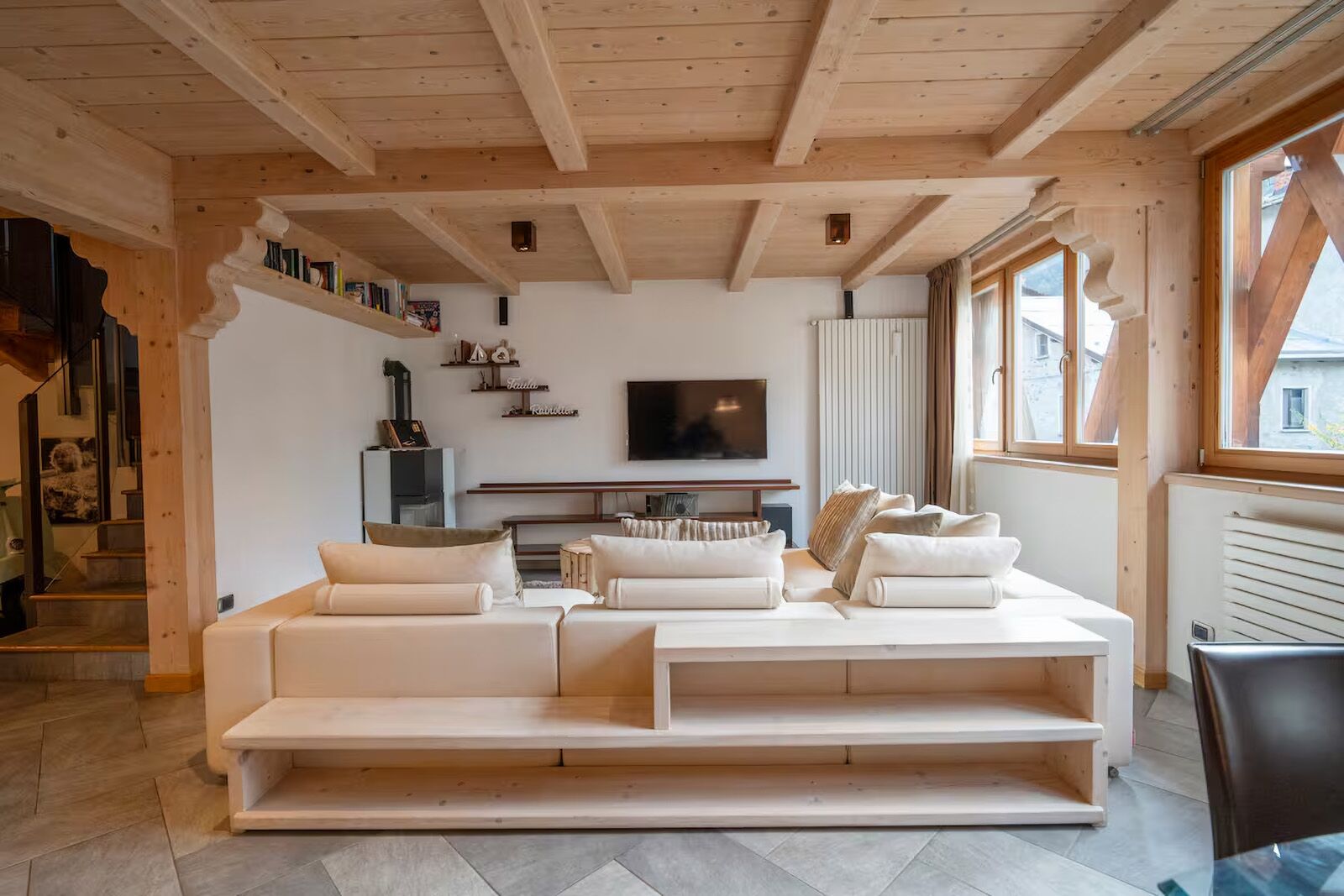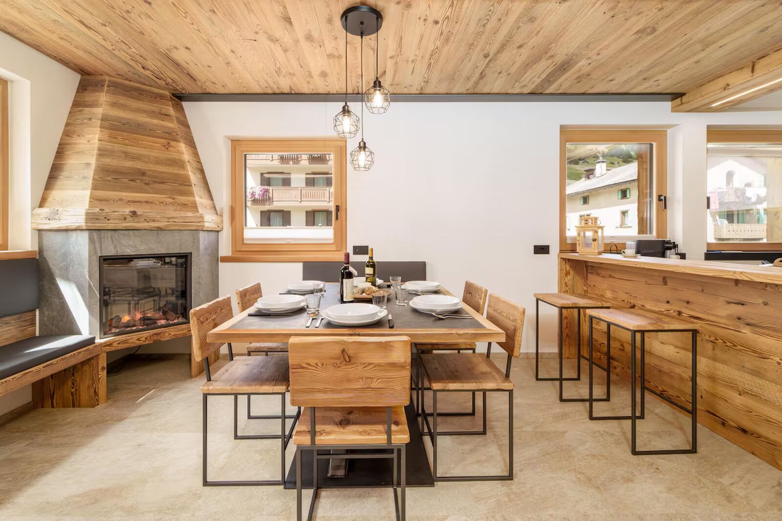 This top-floor apartment in a residential condominium in Livigno, Lombardy, is a short walk from the town center with access to the public buses and use of a heated car parking space. During winter, it carries ski-in/ski-out privileges. The lounge overlooks the cross-country ski field, and there’s a small balcony that catches the afternoon sunshine. Despite being a condo, the woody interiors make the place feel more like a chalet.