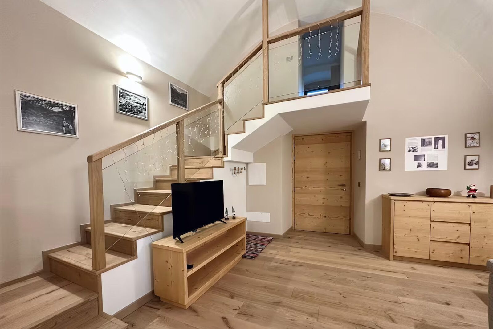 This exceptional apartment overlooks the famous Stelvio Pass and is close to the Stelvio Ski Center, host of alpine skiing and ski mountaineering. It has two double bedrooms, one single twin bedroom, and a crib, while the larger bathroom has a corner tub. A stroller is available upon request, making it one of the best winter rentals for families. Set in a renovated barn, the property also has ski storage and parking.