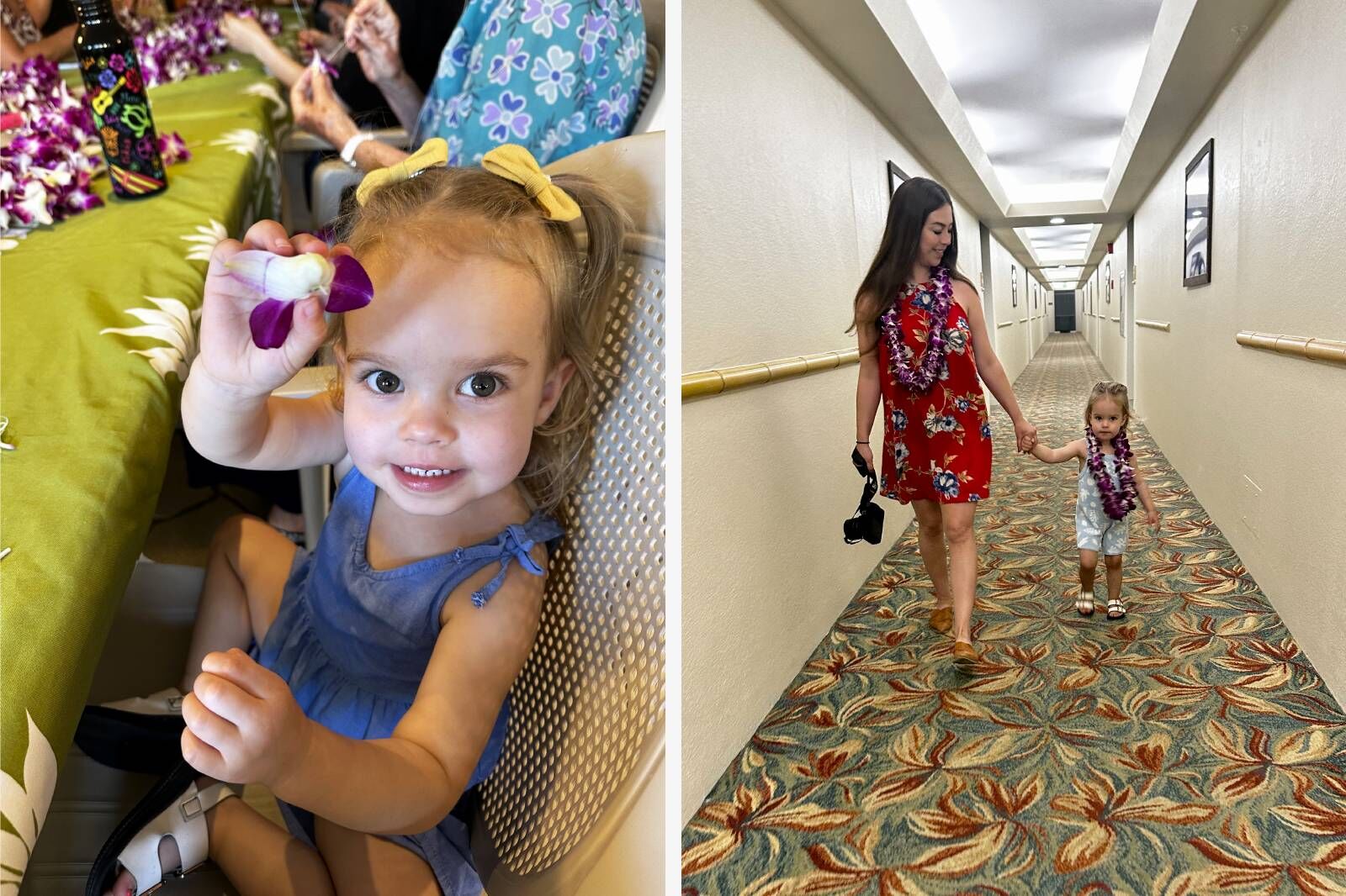 On our last day, Margot and I joined a lei-making class in the lobby. The instructor, and the other guests, had some doubts as I sat my toddler at the table. Lei involve a fair amount of hand-eye coordination to open the orchids, weave through a long and sharp needle, and then thread the flowers together. We found our rhythm, Margot opening up the flowers and me handling the sharp ends, thanks to our instructor who was game to help after clarifying she wouldn’t be responsible for pricked fingers — mine or Margot’s. We ended up making two short leis just as fast as the rest of the table and Margot wore hers the next day until the flowers drooped past wearability.