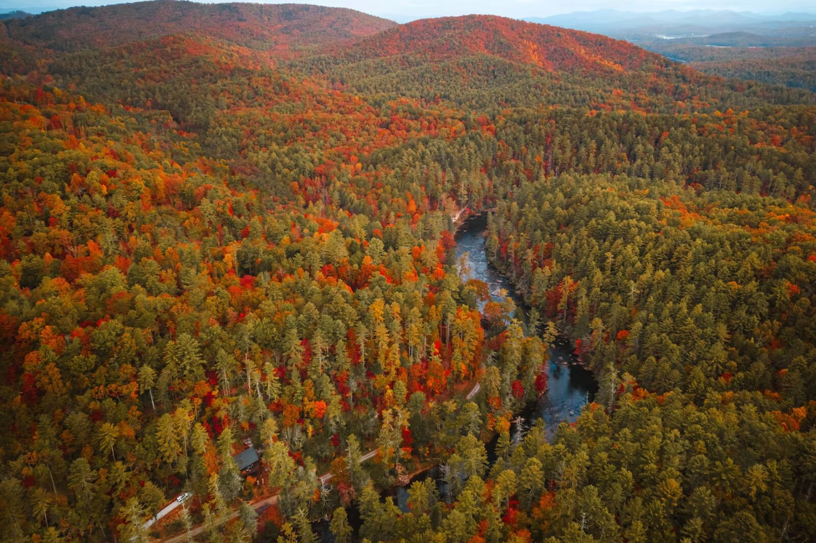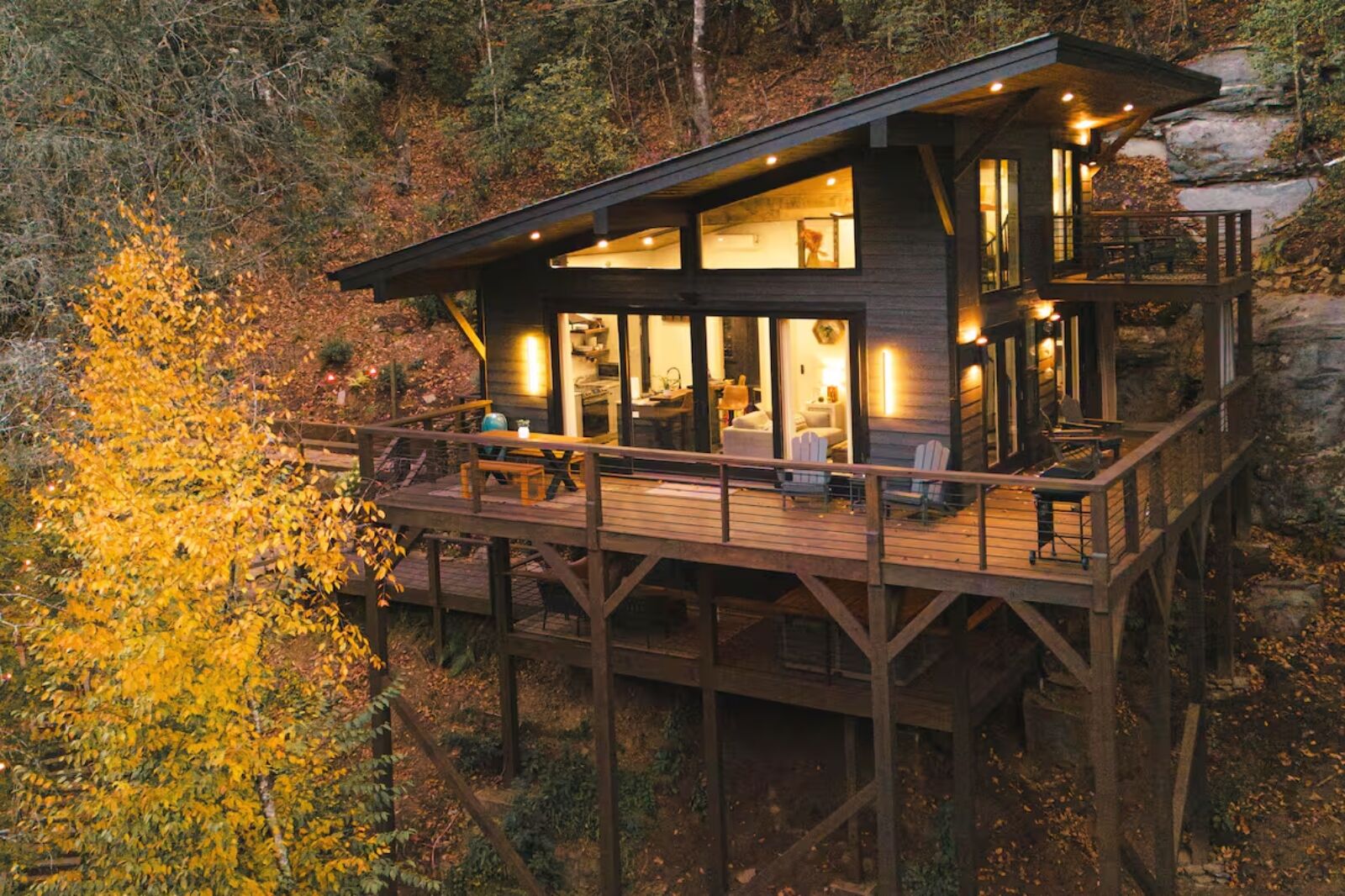 Blue Ridge, Georgia, is a picturesque town in the foothills of the Southern Appalachians. This region offers a stunning display of fall foliage. As the temperatures cool and days shorten, the deciduous trees in the region begin to transform, painting the landscape in vibrant hues of red, orange, yellow, and purple. You can enjoy the colors from this new modern mountain treehouse, which is secluded but close enough to downtown Blue Ridge for shopping and meals out. There’s a fire pit by the river and a walking path to the Aska Trail System. This Airbnb is one of the rental site’s top five percent of homes, which means it’s been awarded for exceptional guest reviews and host communication.