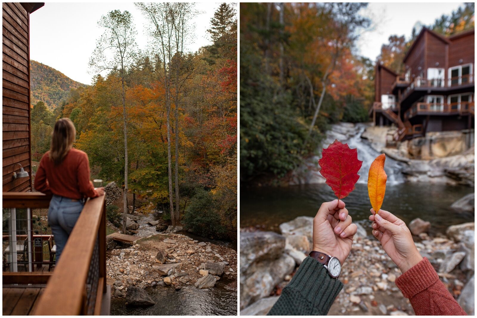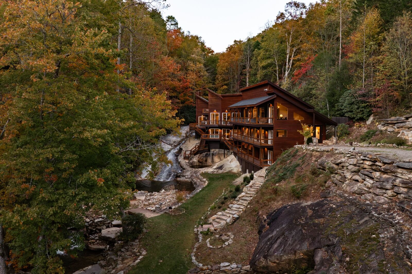 This five-bedroom house in North Carolina’s Nantahala National Forest sits so close to its private 60-foot waterfall that the decks stay damp. October brings a slow, staggered shift in the trees — the ridgelines near Highlands and Cashiers turn first, with color creeping downhill toward Franklin over the course of the month. The rooms open directly to the water. There’s a 10-person hot tub next to a second, indoor cascade, a stone fireplace in the main room, and a footbridge that crosses the stream to a fire pit on a small island.