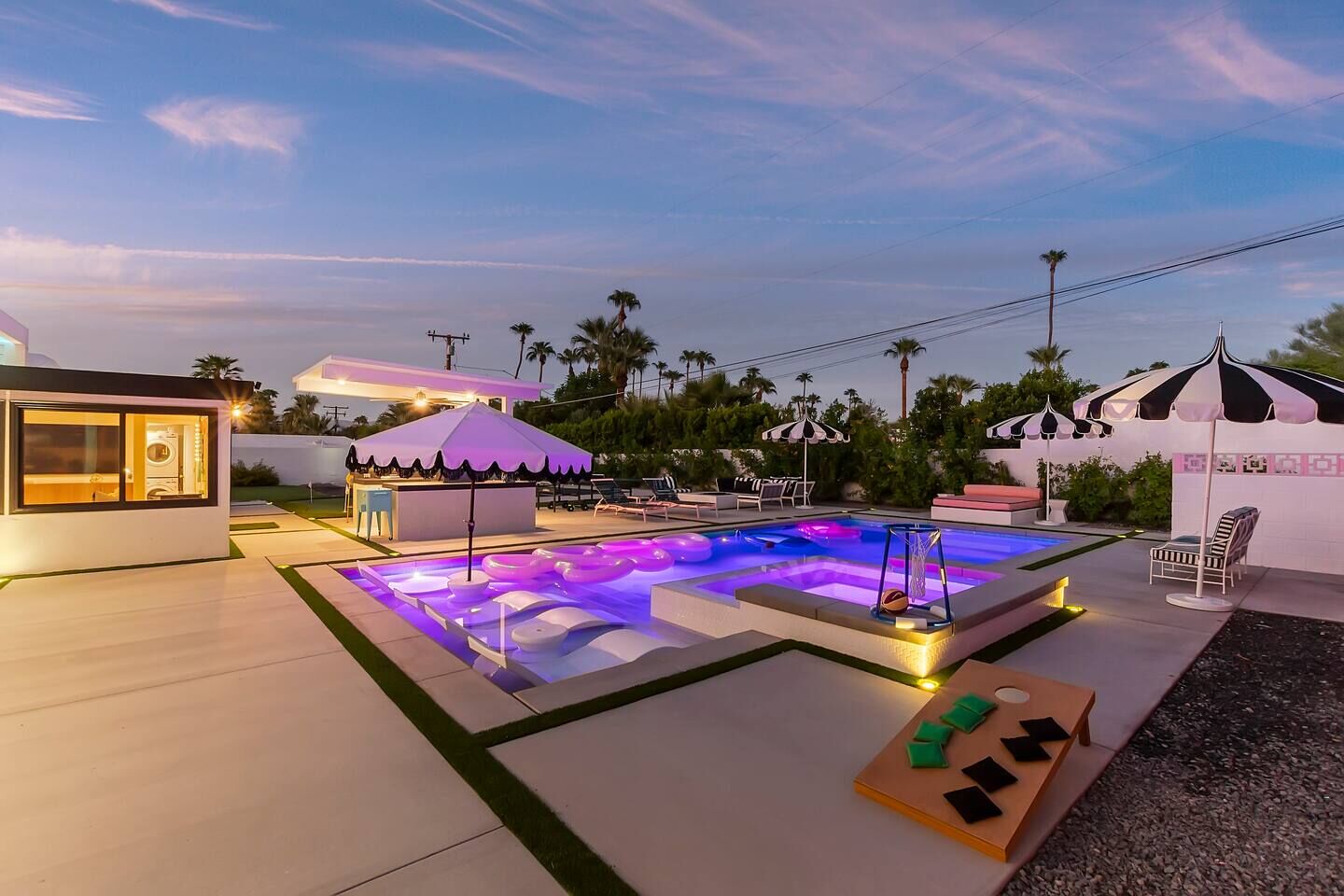 Relax in the private pool equipped with a waterslide and spa, or play a friendly game of billiards at the pool table. There’s also a shuffleboard table. Watch a movie while cozying up across the sectional couch on the Smart Roku TVs, or gather around the sizable dining table for a hearty meal. There are seven sleeping spaces, including five bedrooms. There are two king-sized bedrooms, three queen beds, one twin bed, and in the casita, there’s another king bed and a set of queen-sized bunk beds.