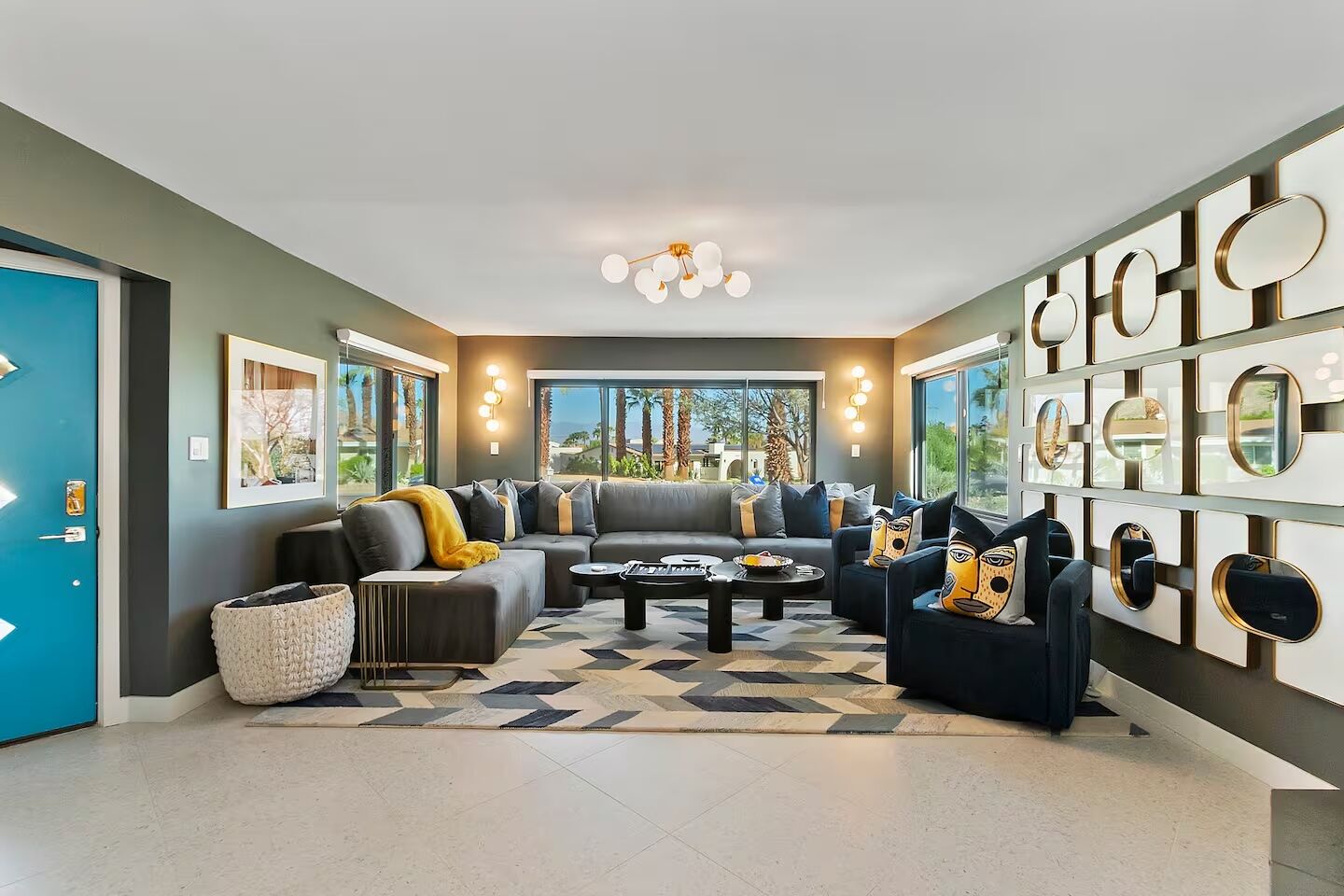 Inside, the spacious living room is outfitted in a coastal chic decor, with tones of blue, white, tan, and silver seemingly bringing the beachy vibes indoors — but also keeping the atmosphere elegant. There’s a full kitchen with stainless steel appliances and vibrant blue cabinetry.