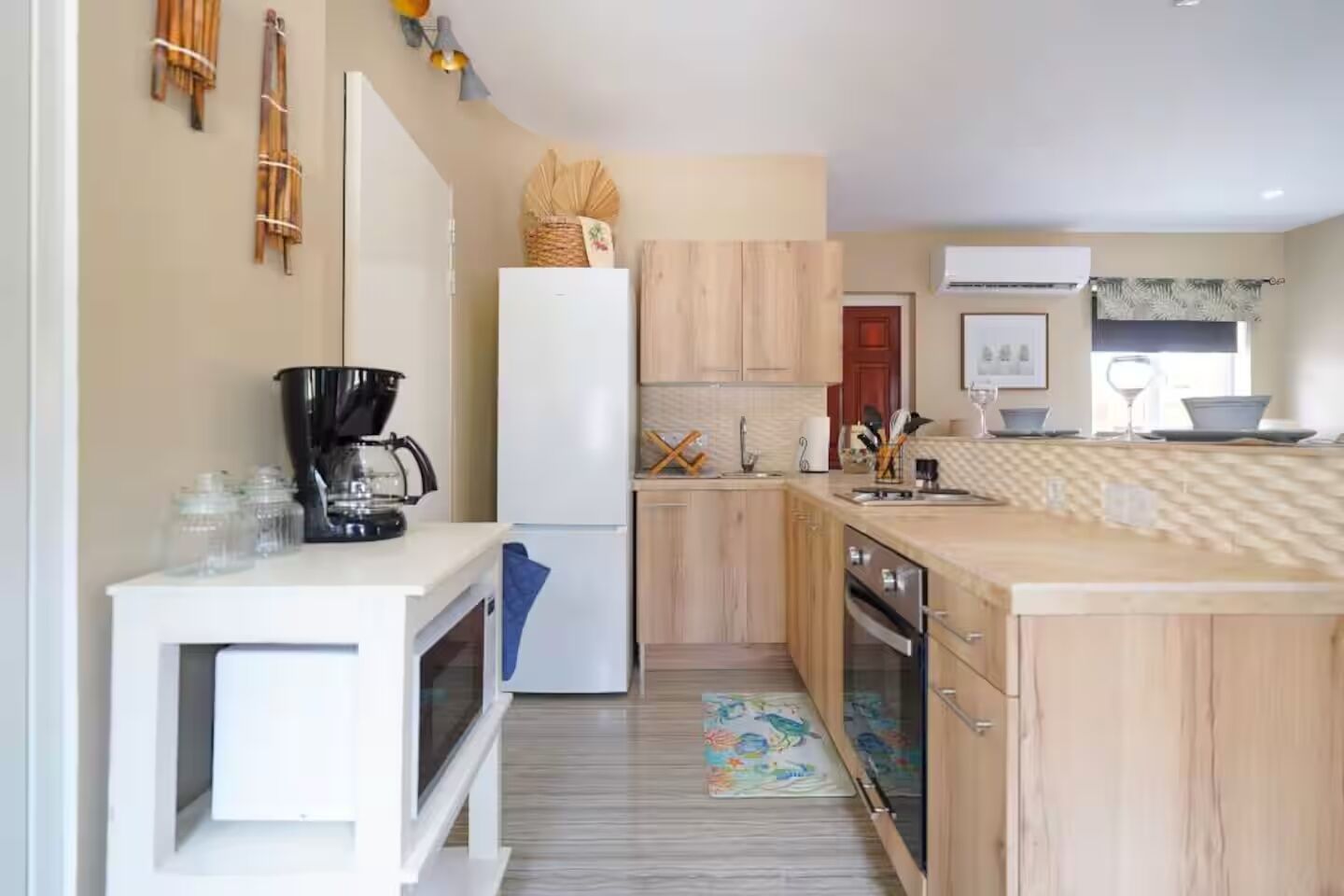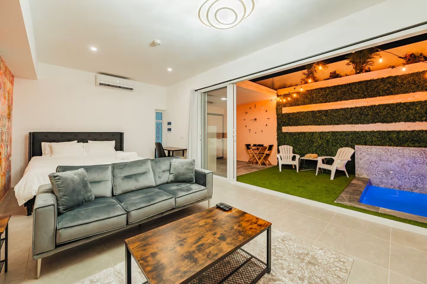 This peaceful Caribbean rental offers the luxury of a boutique hotel at a fraction of the cost. Located in Grote Berg, you’re a 15-minute drive from Willemstad and Curaçao’s beautiful beaches. The studio has a cozy seating area, a modern bathroom, and a fitted kitchen. The saltwater pool and communal outdoor lounge is shared with one other unit and the friendly host couple.