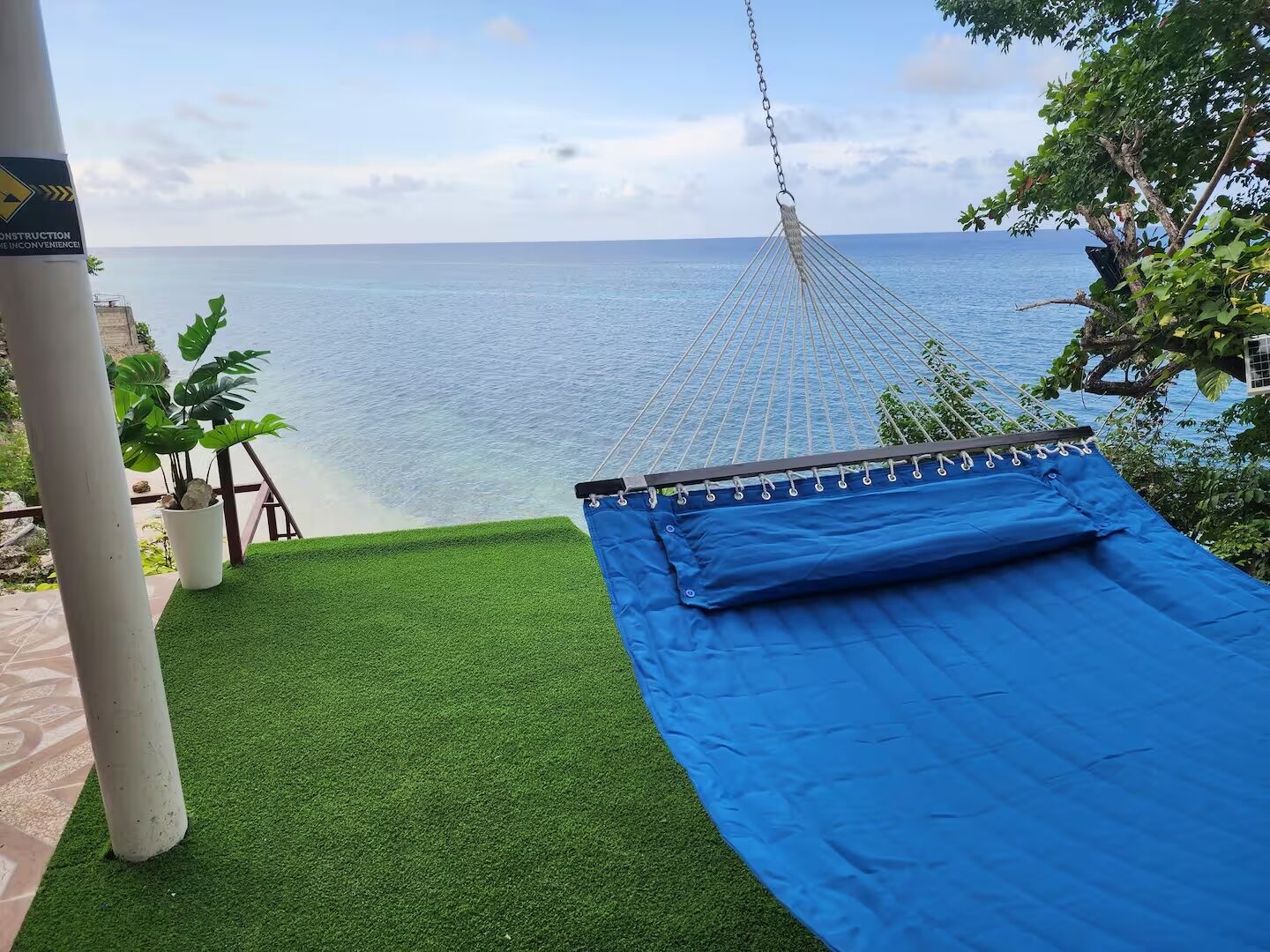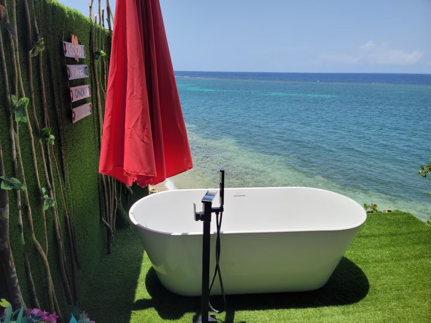 This self-contained vacation unit has its own kitchen and a private, outdoor bathroom. In fact, there are two baths — one is inside the bungalow and the other is on the patio overlooking the Caribbean Sea, accompanied by a hammock for two adults. The beach pictured is private, and this area is especially quiet. Ian Fleming International Airport and the town of Ocho Rios are less than 10 minutes by car.