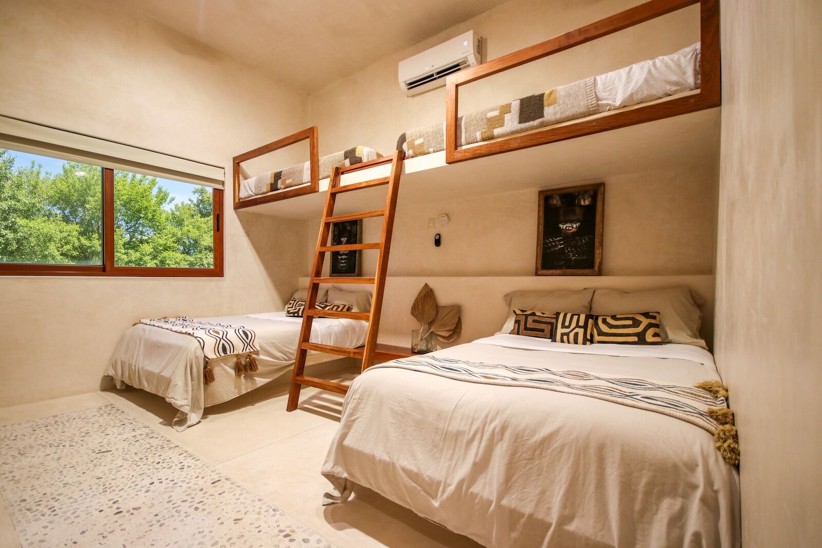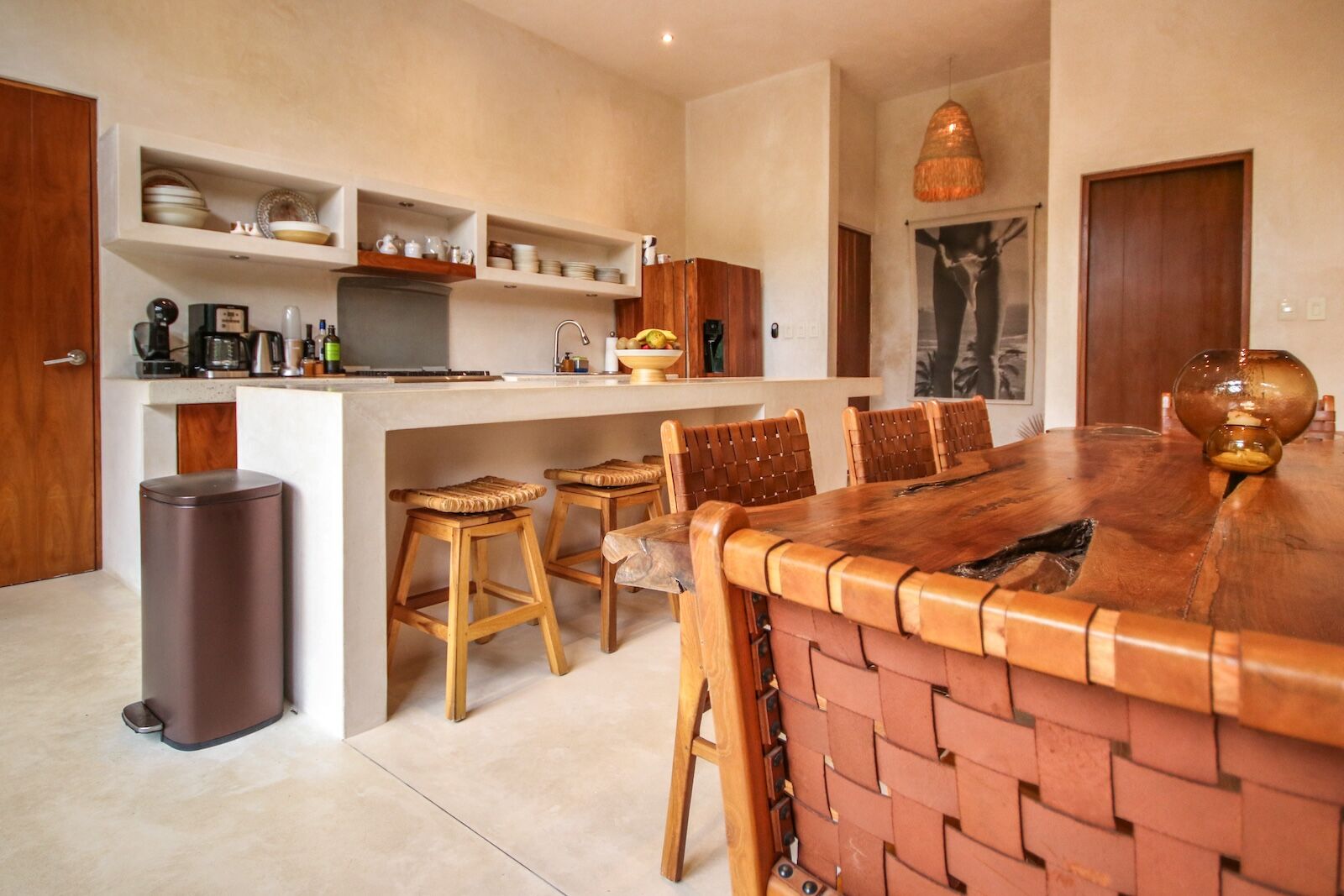 Casa Arca’s interior design perfectly captures Tulum’s signature boho-chic aesthetic. Inside you’ll find several carefully curated contemporary art pieces that give the space a unique character. The open-concept layout and gigantic windows throughout make the apartment very spacious and inviting. The living area has what might be the largest couch with the most pillows you’ve ever seen – perfect for relaxing after a day out exploring. The kitchen is fully equipped and you’ll find everything you could possibly need, including beautiful dinnerware that complements the overall aesthetic.