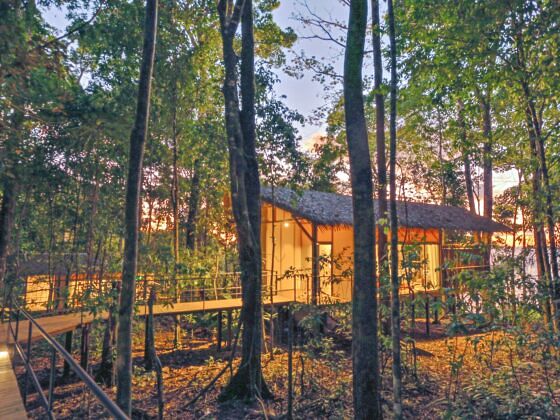In the spirit of leaving as light an environmental footprint as possible, many of the rooms here are built using sustainable materials, and unassumingly tucked away in the rainforest, accessible by a raised wooden walkway. The Oceanview Treehouses manage to be both rugged and modern, surrounded almost entirely by trees, windowed walls on three sides, and with decks overlooking the distant ocean.
