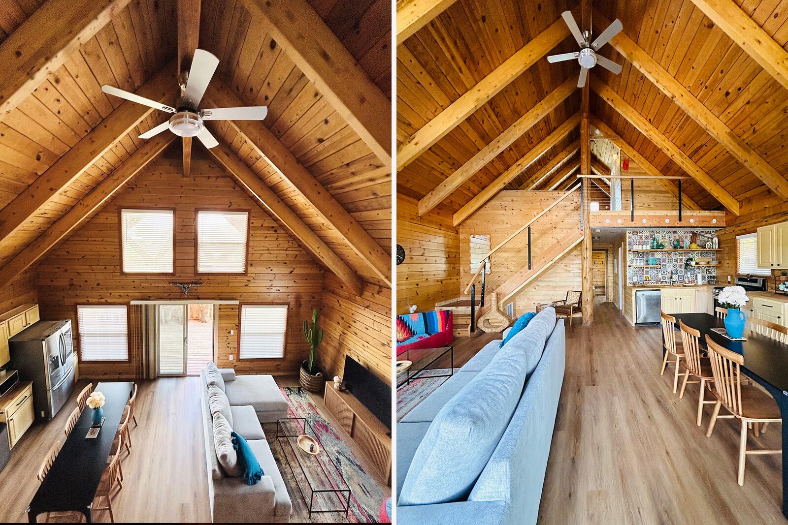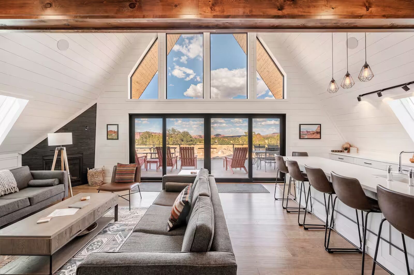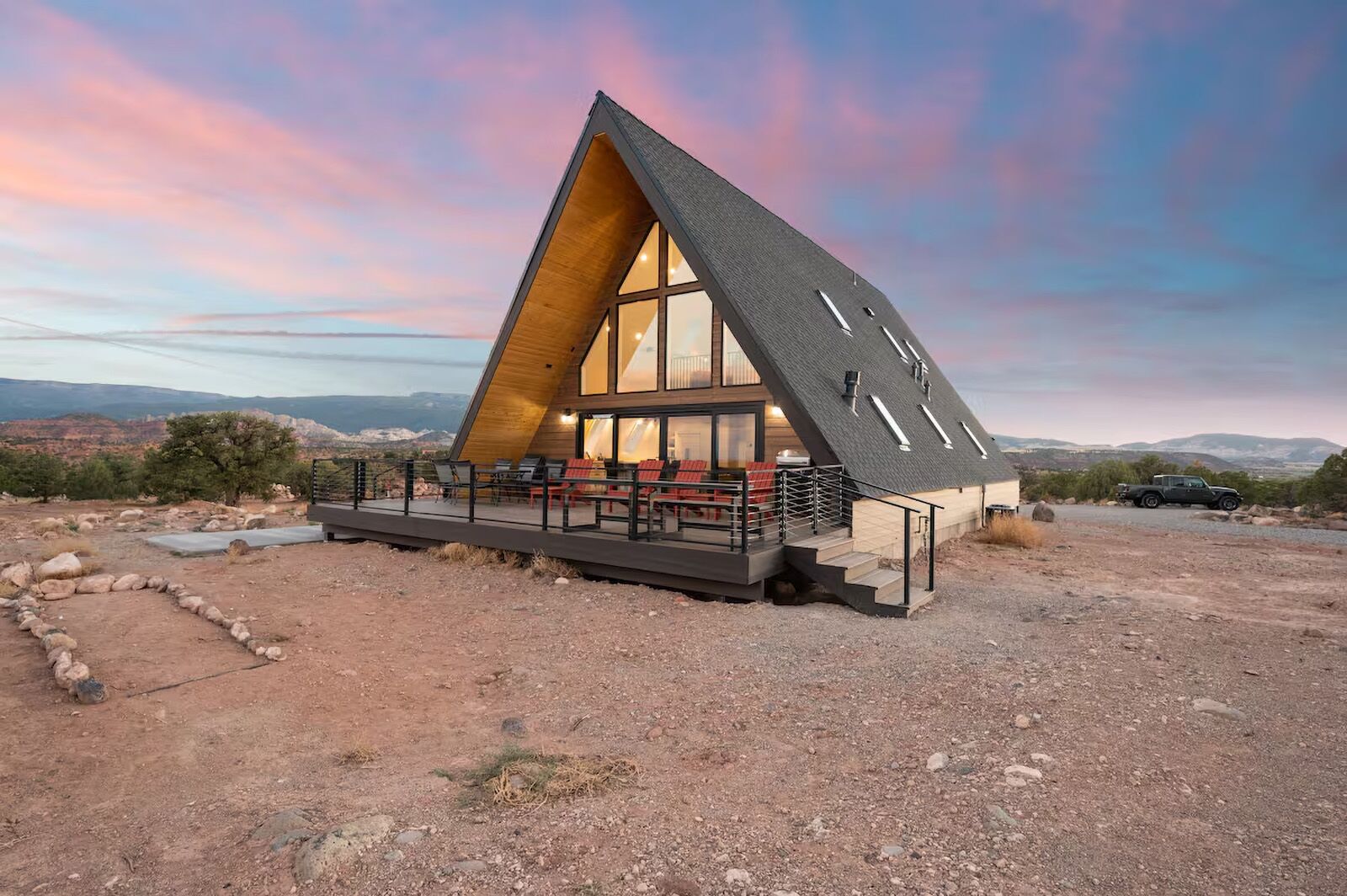 Spend days ogling the red rock canyons of the South Zion Mountains and evenings bobbing in the hot tub under the Dark Sky designated skies. The dog-friendly A-frame cabin grants a comfy glamping hideaway with a private bathroom and an al fresco kitchen that makes vacation cooking far more appealing. With a convertible main door and fire pit, this unique Airbnb is perfect for experiencing Utah’s celestial spectacle as well as sunrises and sunsets.