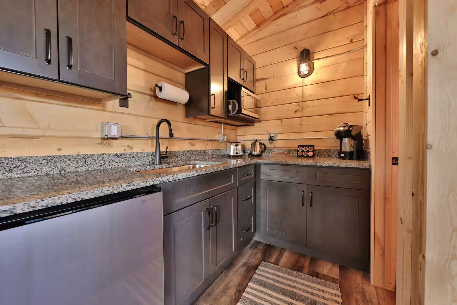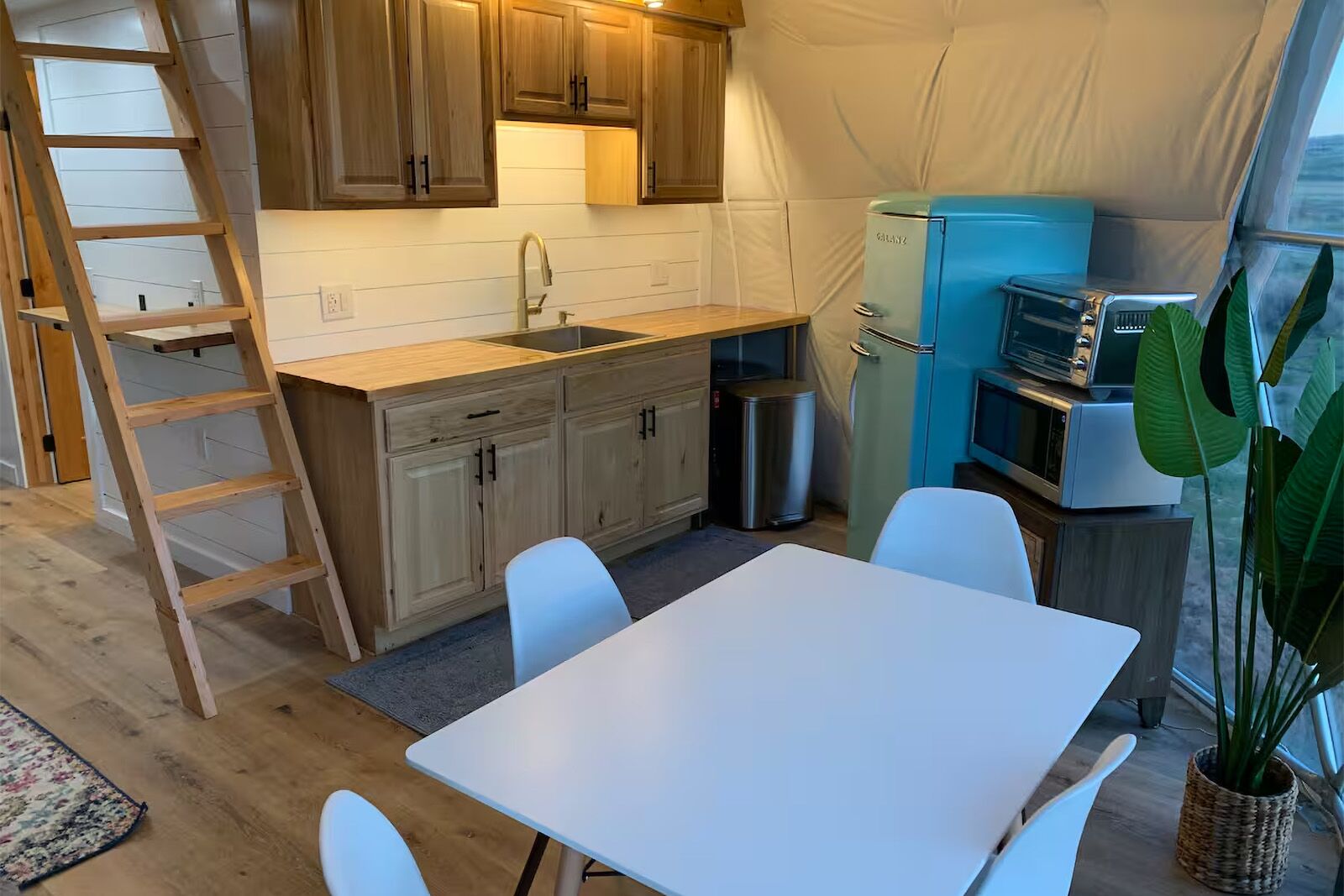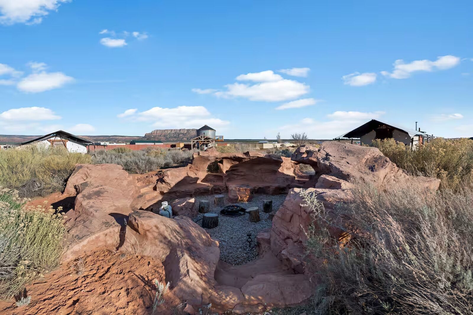 After spending an evening getting blinded by the shiniest stars, retreat to this cave Airbnb in Southern Utah for some shut-eye. The dwelling is a couple of steps below the surface, with basic amenities like an electric fireplace chiseled into the walls. There’s a bathhouse and cooking area right outside, shared with three glamping tents and a silo rental. This unit has a private patio carved into the rocks with a wood-burning fire pit to keep you warm under the night sky.