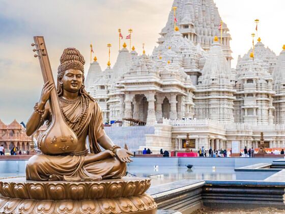 Among the largest Hindu temples on Earth, Swaminarayan Akshardham was built in 2005 as an immersive attraction. Flanking the mighty sandstone temple, which rises more than 140 feet and spans more than 300 feet in both width and length, are three large halls with exhibits that function more like rides.