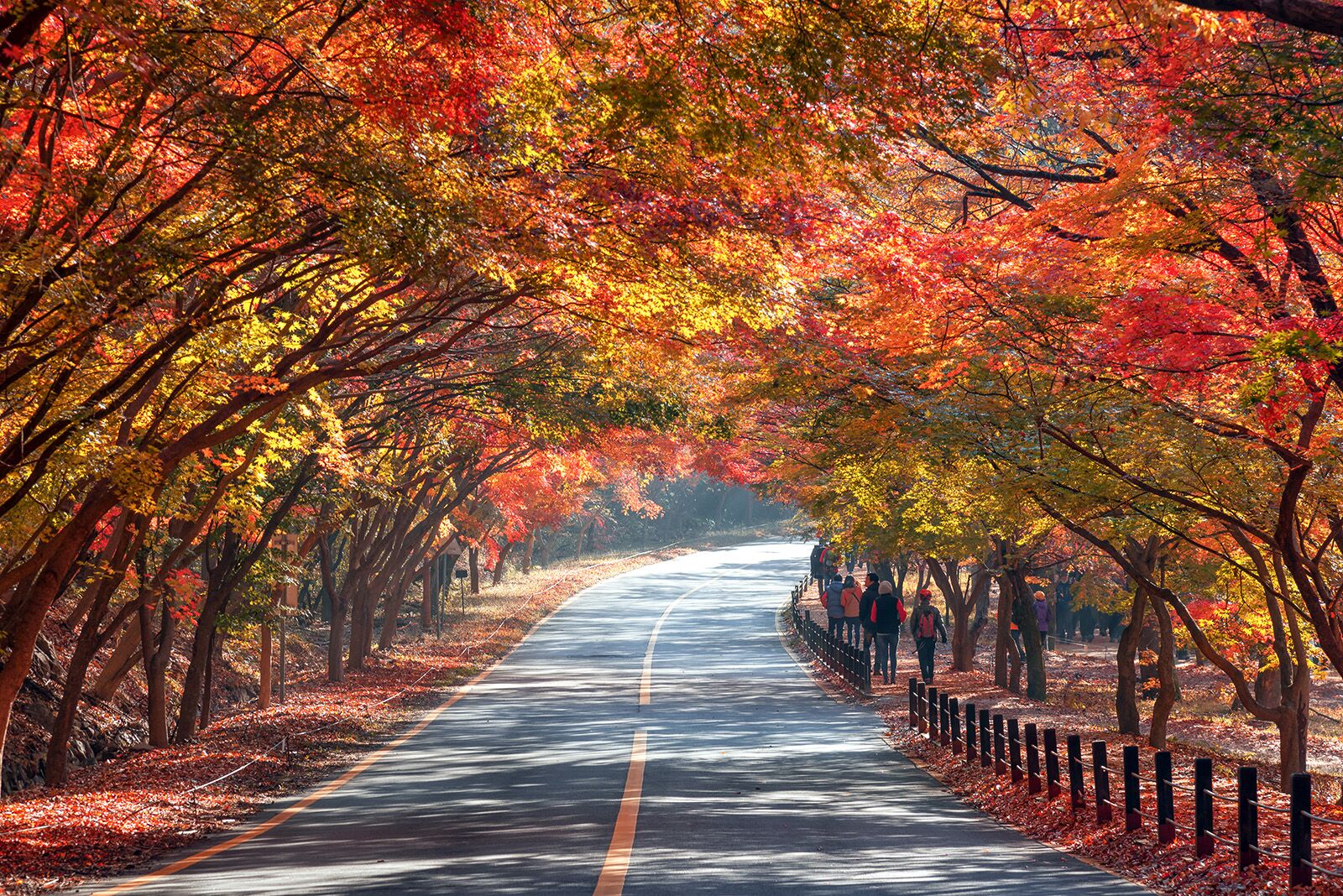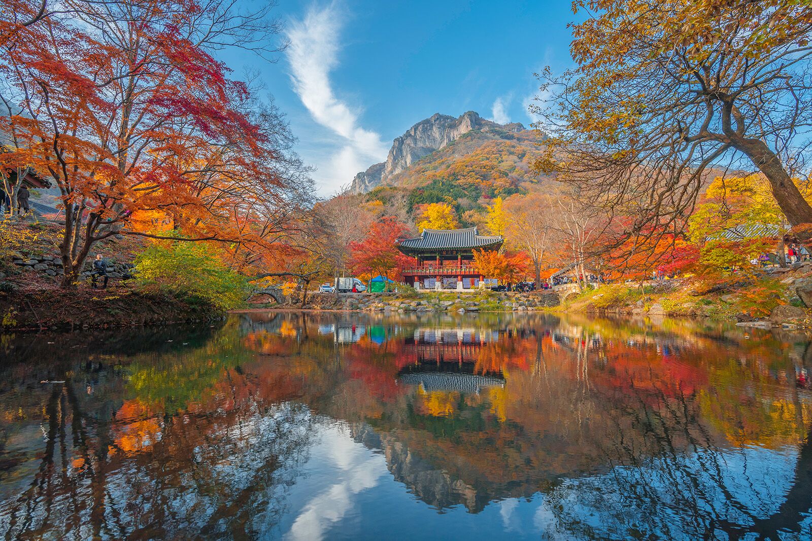 In South Korea, the autumn tradition of danpung-nori — “enjoying the red leaves” — reaches its peak at Naejangsan National Park. The slopes here are home to Japanese and Korean maple species, as well as ginkgo trees. Naejangsan mountain is home to cultural landmarks like the Baekyangsa and Naejangsa Temples, as well as the picturesque Uhwajeong Pavilion. Seven different peaks can be reached through the park’s main hiking route — a moderately challenging, seven-hour trek. Remember to check the dates of the Naejangsan Maple Festival in nearby Jeongeup.
