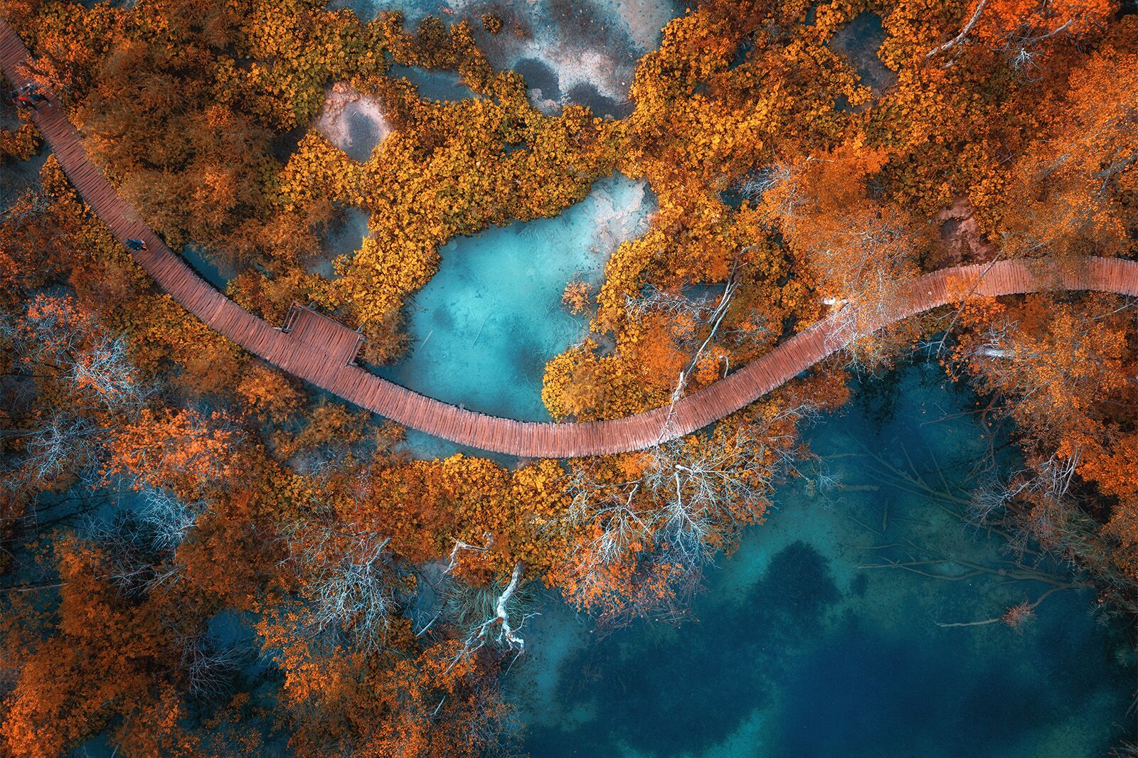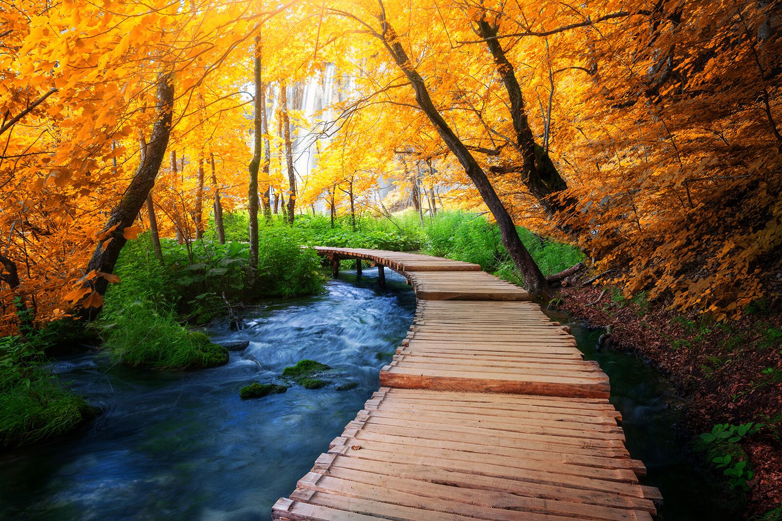 Plitvice Lakes is Croatia’s largest national park. The already visually-stunning landscape of never-ending waterfalls takes on a new hue in the fall, when beech, maple, and hornbeam trees turn to shades of gold and crimson. The park’s wooden boardwalks wind between 16 terraced lakes connected by more than 90 waterfalls, making the fall foliage visible from multiple vantage points. The cooler weather means smaller crowds, allowing clearer views of sites like Veliki Slap, the park’s tallest waterfall at 256 feet.