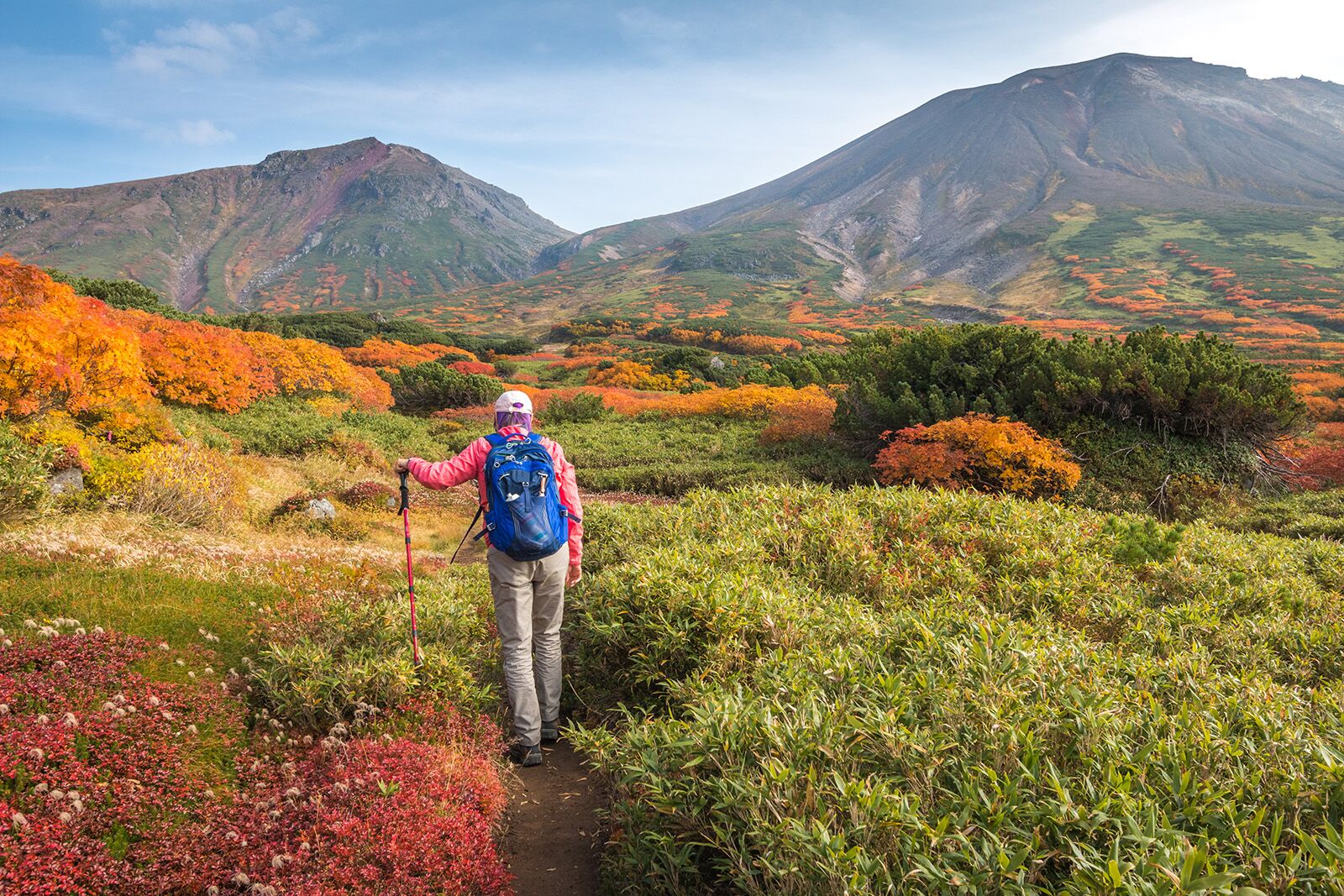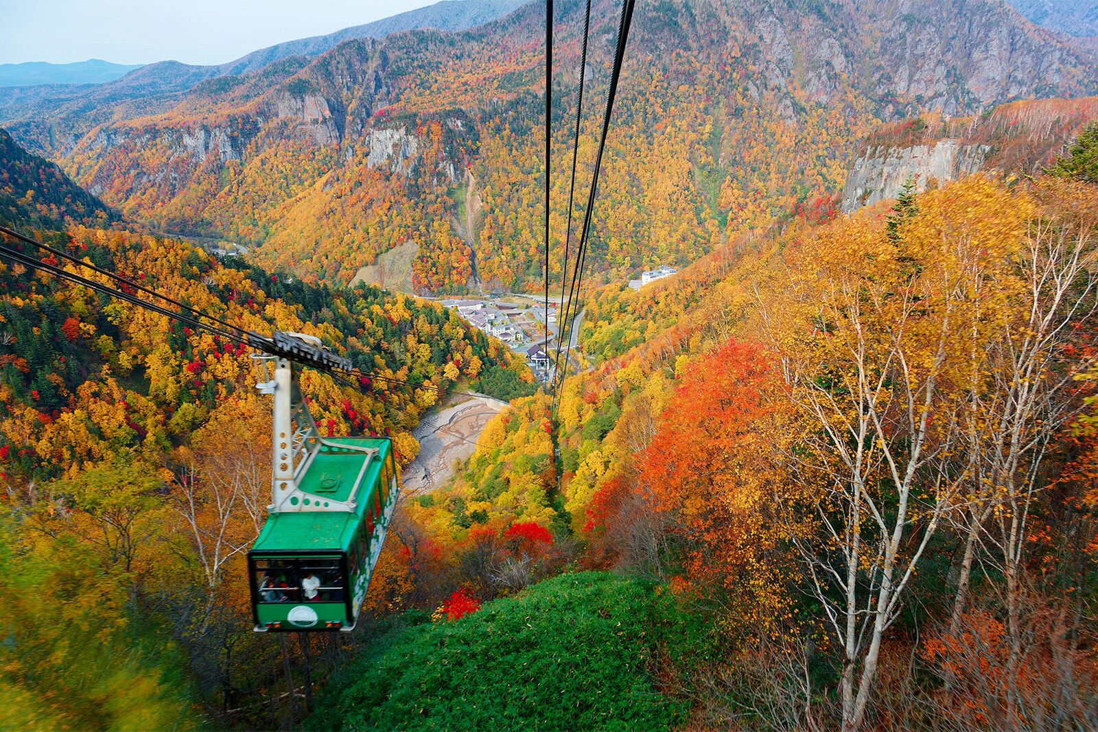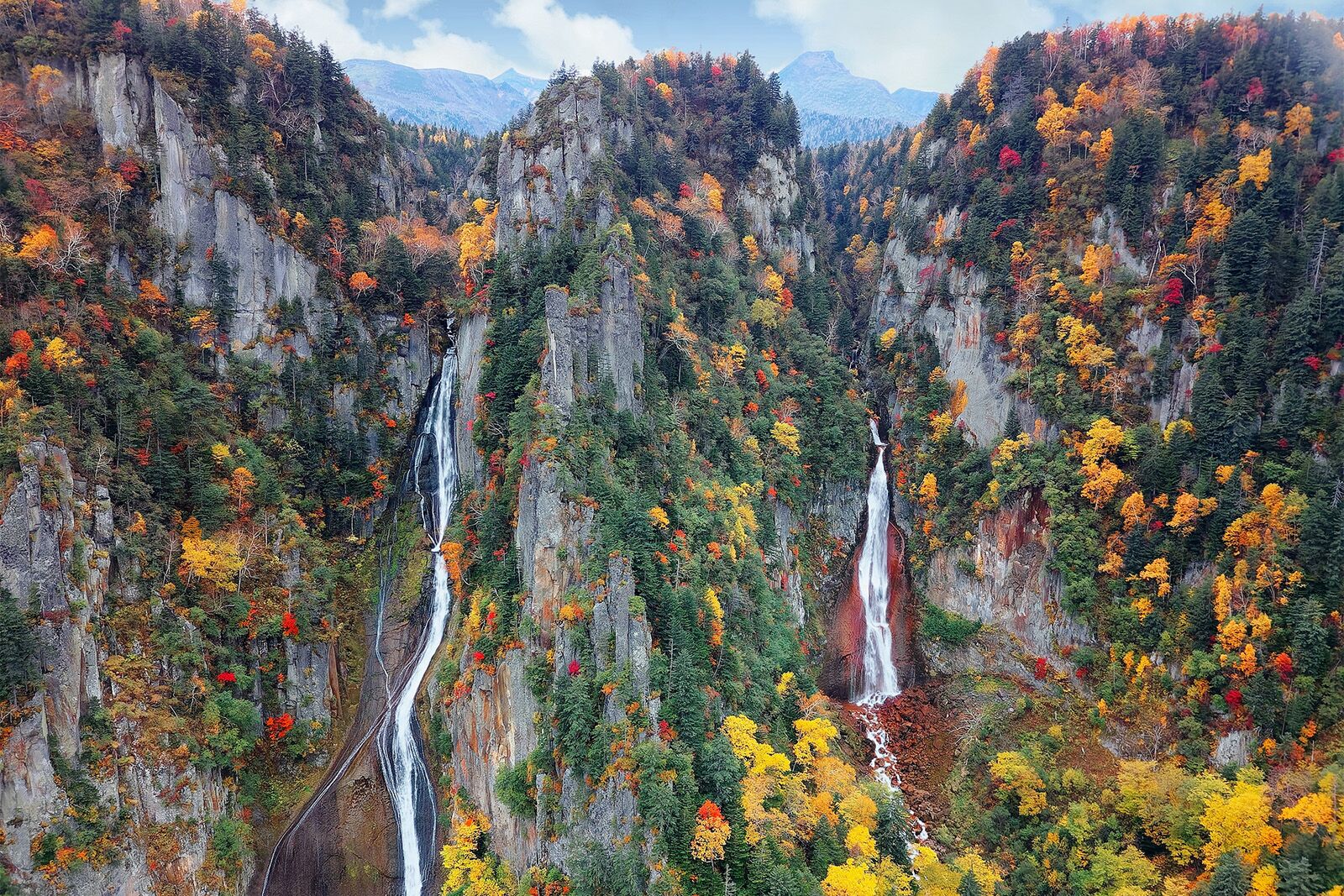 Hokkaido’s Daisetsuzan National Park, Japan’s largest and oldest protected wilderness, is home to the country’s earliest fall foliage. Rugged volcanic peaks and alpine meadows change first as nanakamado shrubs flush scarlet. Visitors can ascend the Asahidake and Kurodake ropeways for sweeping views, or hike around Sugatami Pond, where fiery slopes reflect in still waters. Nearby Sōunkyō Gorge adds its own drama with the Ginga and Ryusei waterfalls framed by vibrant leaves.