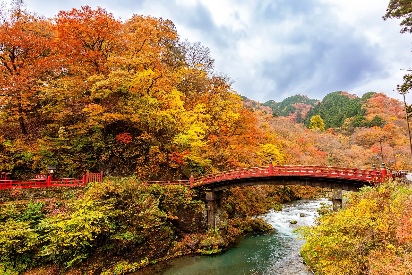 Japan’s centuries-old tradition of momijigari — “hunting for red leaves” — comes alive in Nikko, a mountainous region north of Tokyo. It’s one of the most celebrated destinations for fall foliage in the country not only for its vivid colors, but also for the abundance of dramatic backdrops like Kegon Falls, Chuzenji Lake, and the area’s historic Shinto shrines and Buddhist temples. Japanese maples glowing red and golden ginkgos are the defining trees of the season, joined by other species such as azaleas, mountain cherries, and alders.