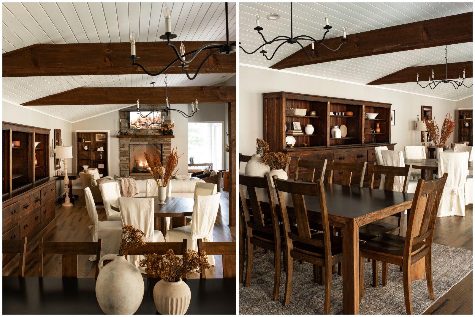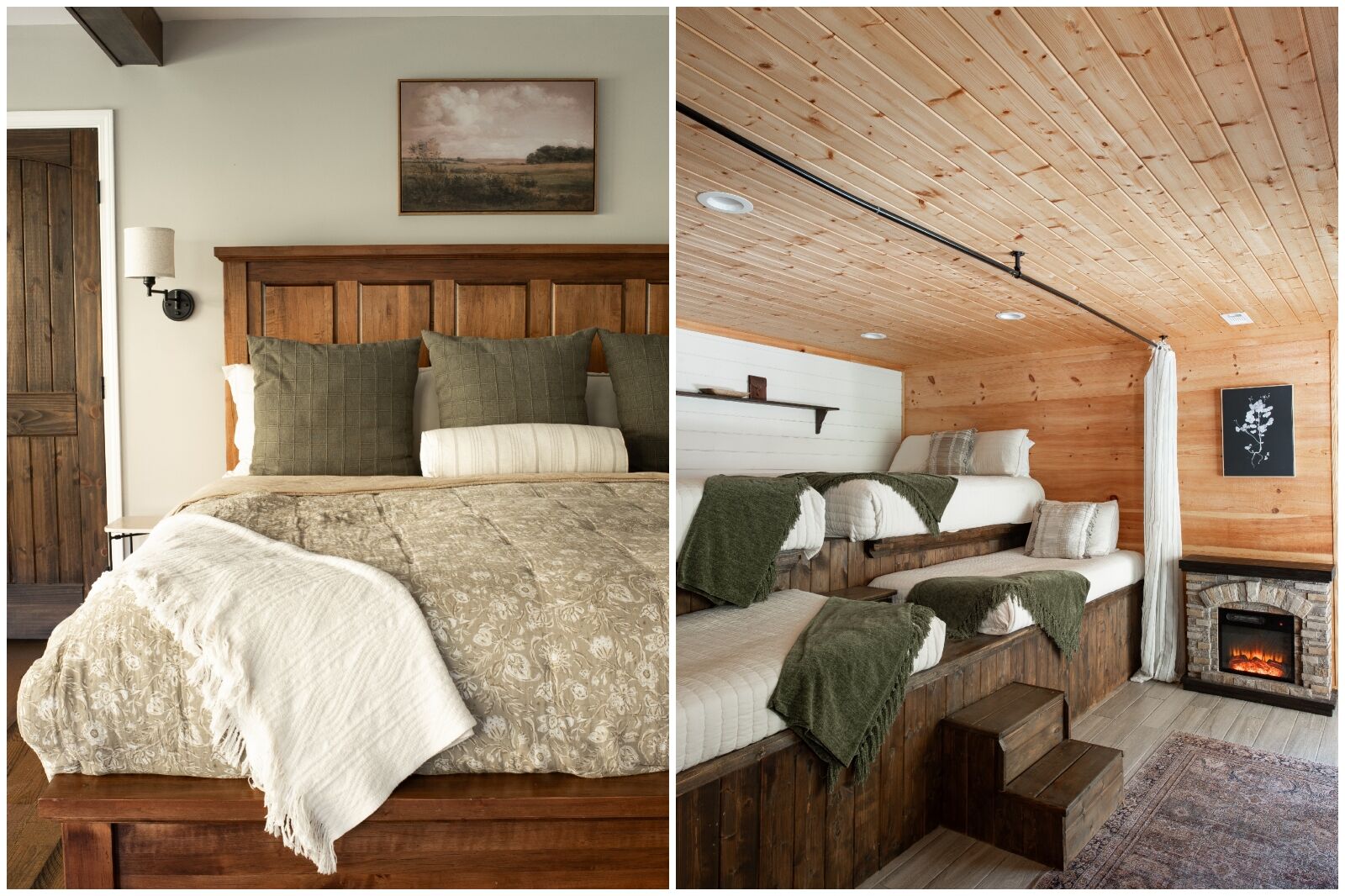 There are five bedrooms, and each one opens to a deck over the water. One suite has two fireplaces and a private perch facing the falls; another sits steps from the riverbank. The bunk room offers two queens and two twins — perfect for kids, or whoever pulls the short straw.