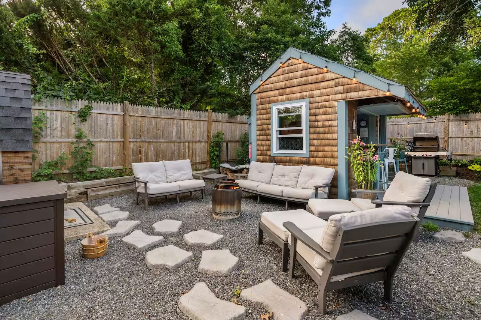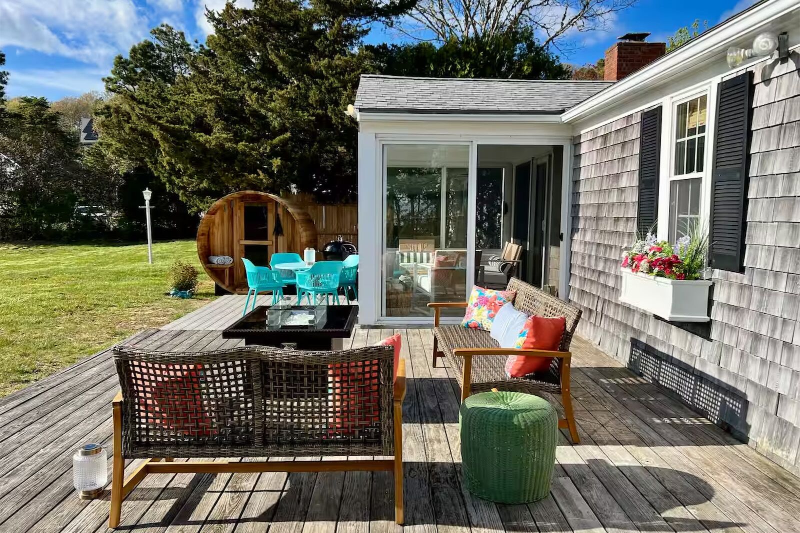 Fun and funky, this beachy getaway is a comfortable house for a gang. Grab your swimsuits and your besties for a vacation stay in one of the coziest Cape Cod Airbnbs with a spacious living area and kitchen, and easy access to the surrounds. The large deck, open kitchen, and cozy furniture set the tone for a getaway stay to refresh your spirit. The fire pit is the perfect spot for evening gatherings with great conversation and S’mores.