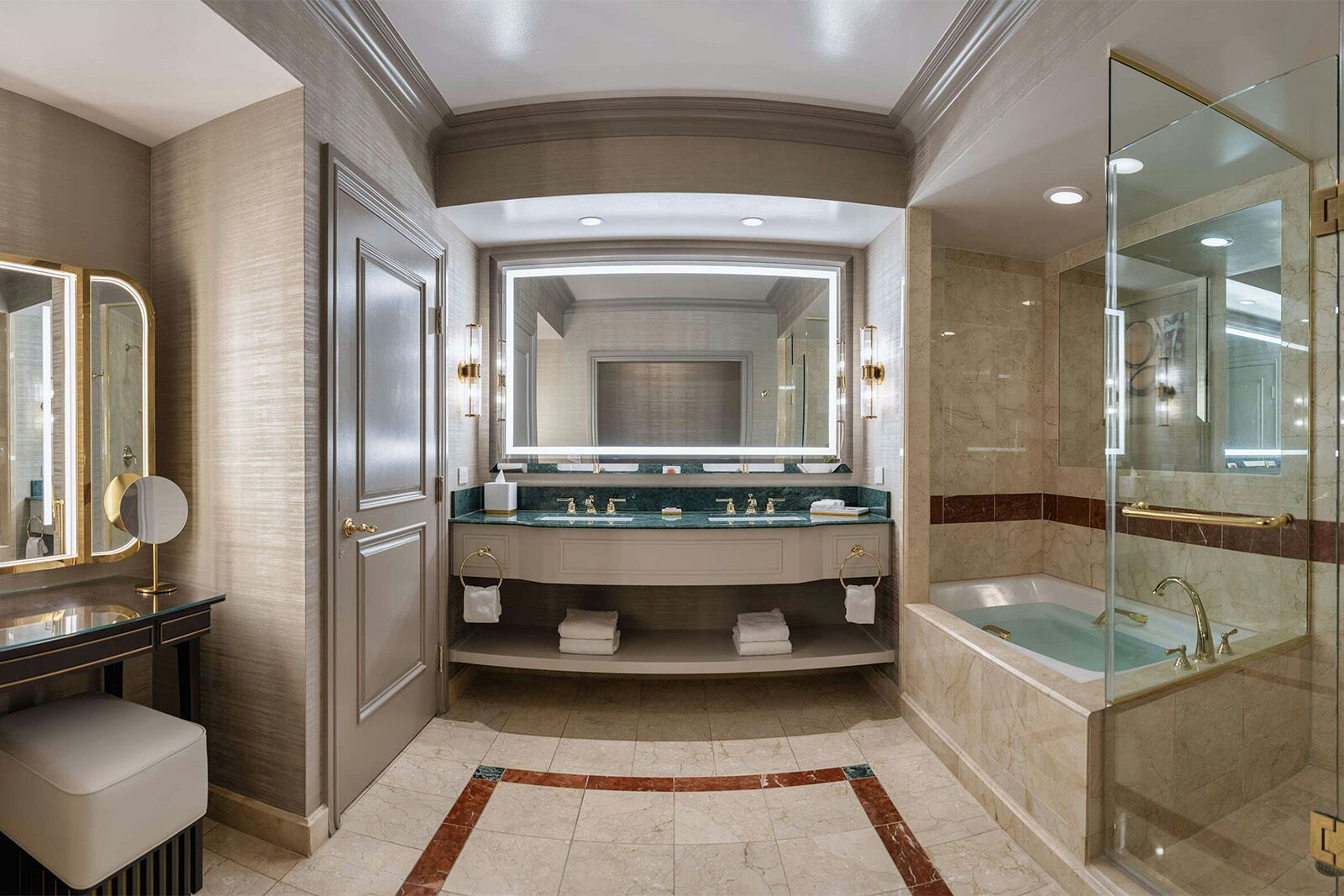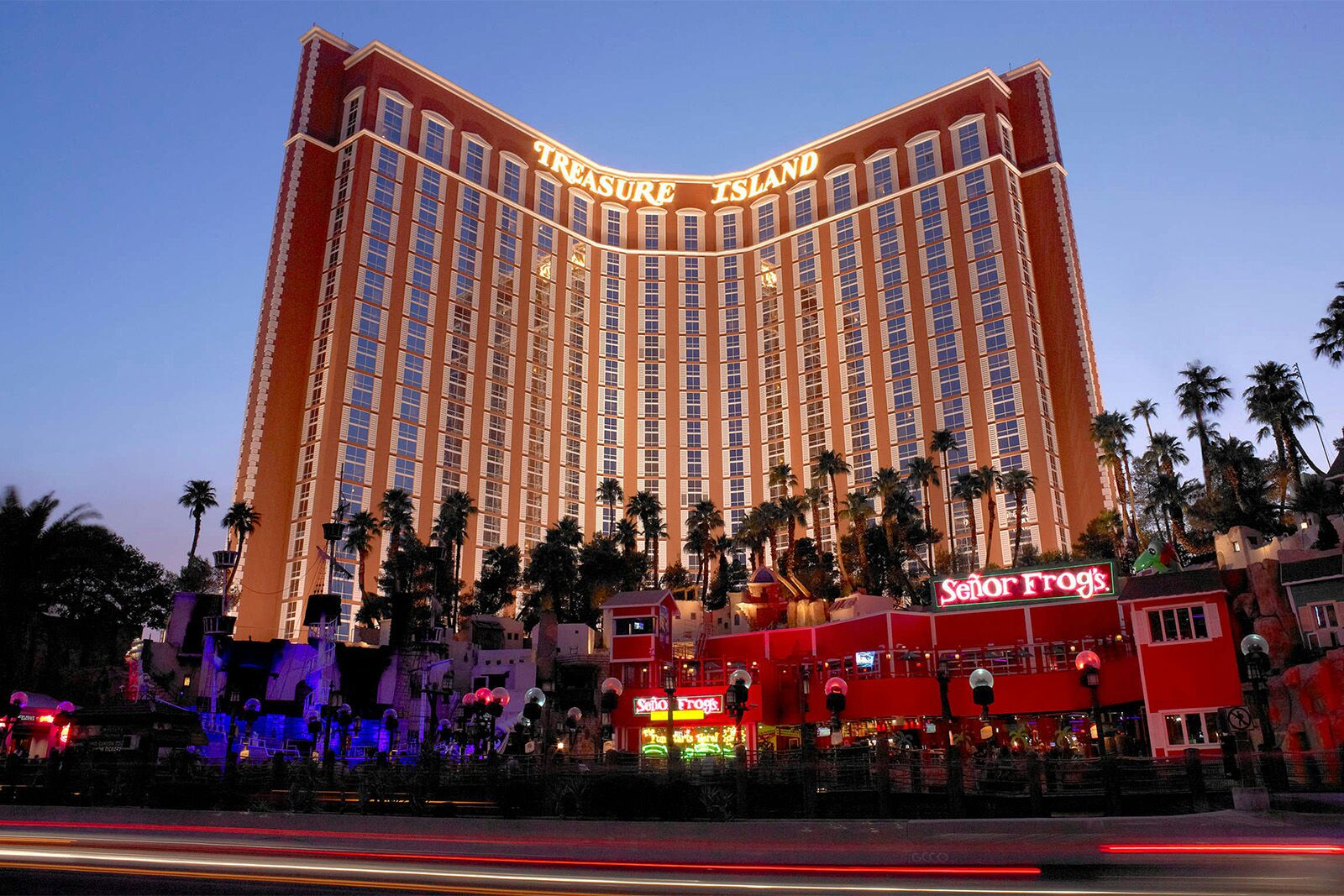 The rooms aren’t quite as cavernous as The Venetian, but they’re still larger than average. Even entry-level units come with posh marble bathrooms where you can get ready for a night on the town. Fancier suites at the Treasure Island Hotel have whirlpool tubs and Strip views. In addition to the casino and famous lagoon pool, the resort has a slew of restaurants and bars and hosts the resident Cirque du Soleil production, Mystère.