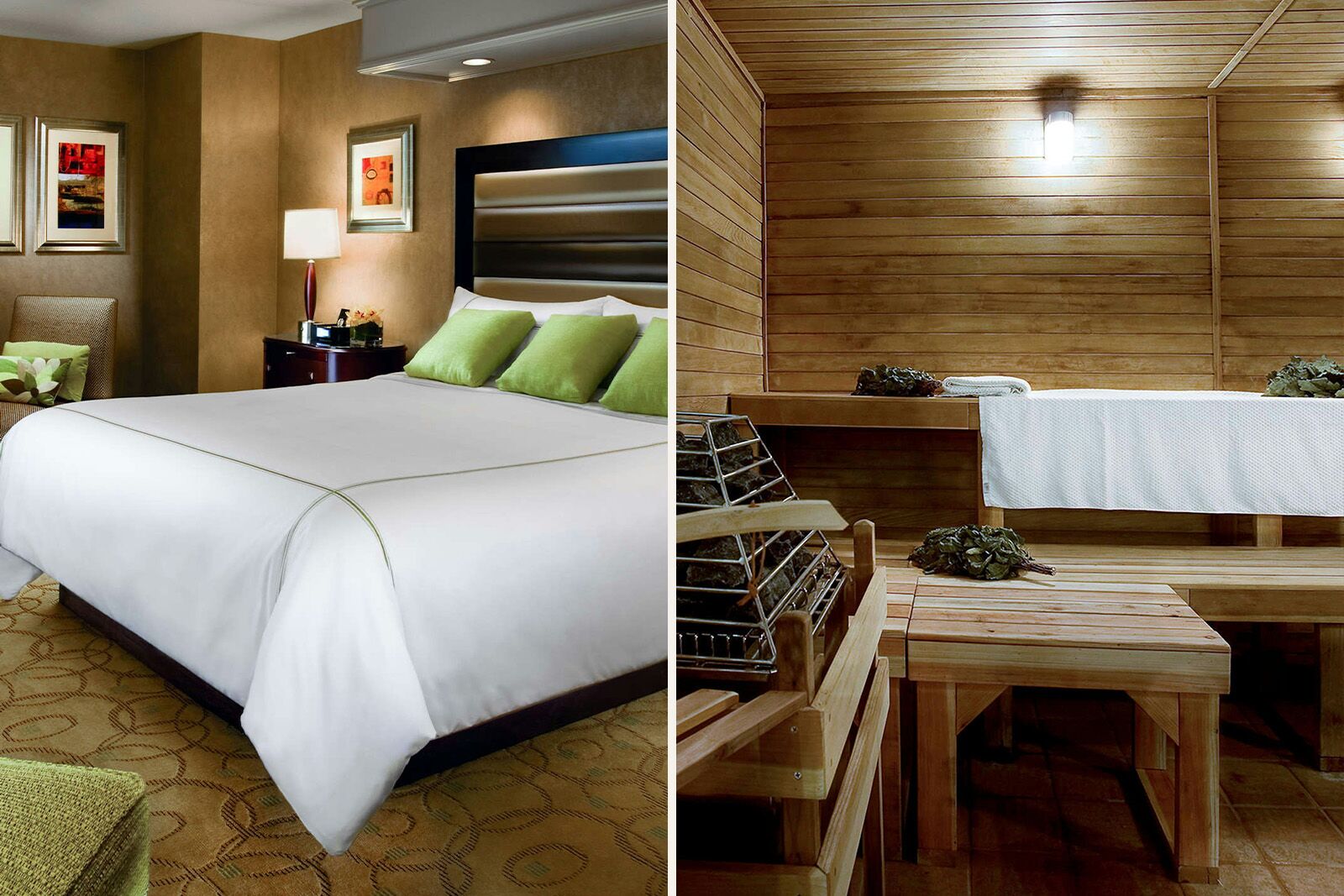 Located just off the Las Vegas Strip, Palms Casino Resort is one of the more modern places to stay in Sin City with awesome art in each room. Even the basic units have floor-to-ceiling windows with Strip views, and a nook for taking in the neon from above. For a baller experience, check out the rates for the Sky Villas and Penthouses. The resort has a spa, pool, and casino, as well as a classy rooftop lounge, the Ghostbar, with skyline views.