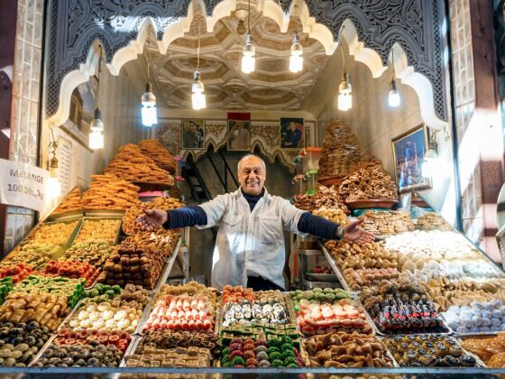 I noticed an intentionally welcoming atmosphere outside of traditional restaurants and hotels, too. During a dinner at The White Camel, a tented camp in the Agafay Desert, I doubt even a professional eater could finish all the food served to my table. That night, we enjoyed tagine, an assortment of salads, and lham bel barkouk (beef and prunes). Other dishes commonly served include briouats (crispy pastries often filled with meat), taktouka (a salad of tomatoes and peppers), and lentil soup, not to mention couscous and mint tea, which always seem endless. If the impressive spread wasn’t welcoming enough, the troupe of Amazigh musicians playing Moroccan-inspired blues music in the background helped, as they were clearly happy to be putting on a show.
