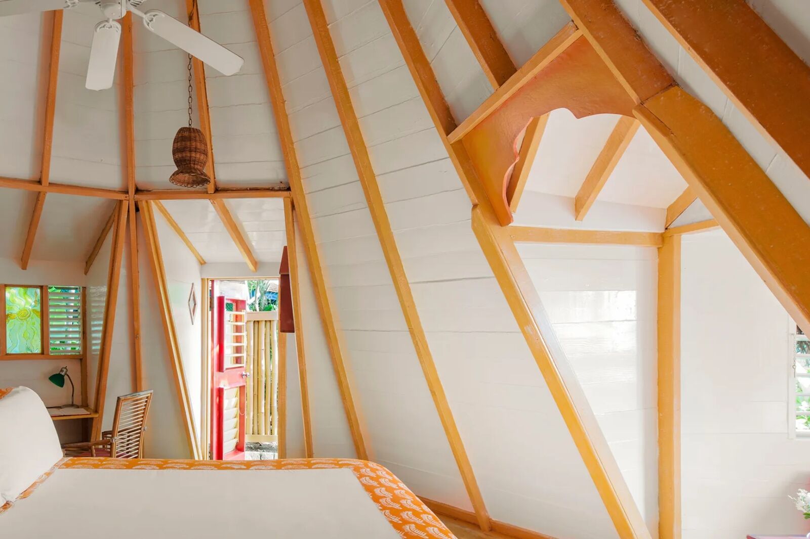 The resort features 12 secluded cottages set within the property’s tropical gardens along the cliff edge. Brightly colored textiles, artwork, and stained glass accent the palm wood and straw of the cabins, and each has a queen-sized bed, a stocked minibar with local treats, and an outdoor shower. For those looking to celebrate a special occasion, you can book a private candlelit five-course dinner in one of the caves or at a private spot along the cliff face. The saltwater pool and outdoor hot tub are set along the cliff edge, suspended above the ocean.