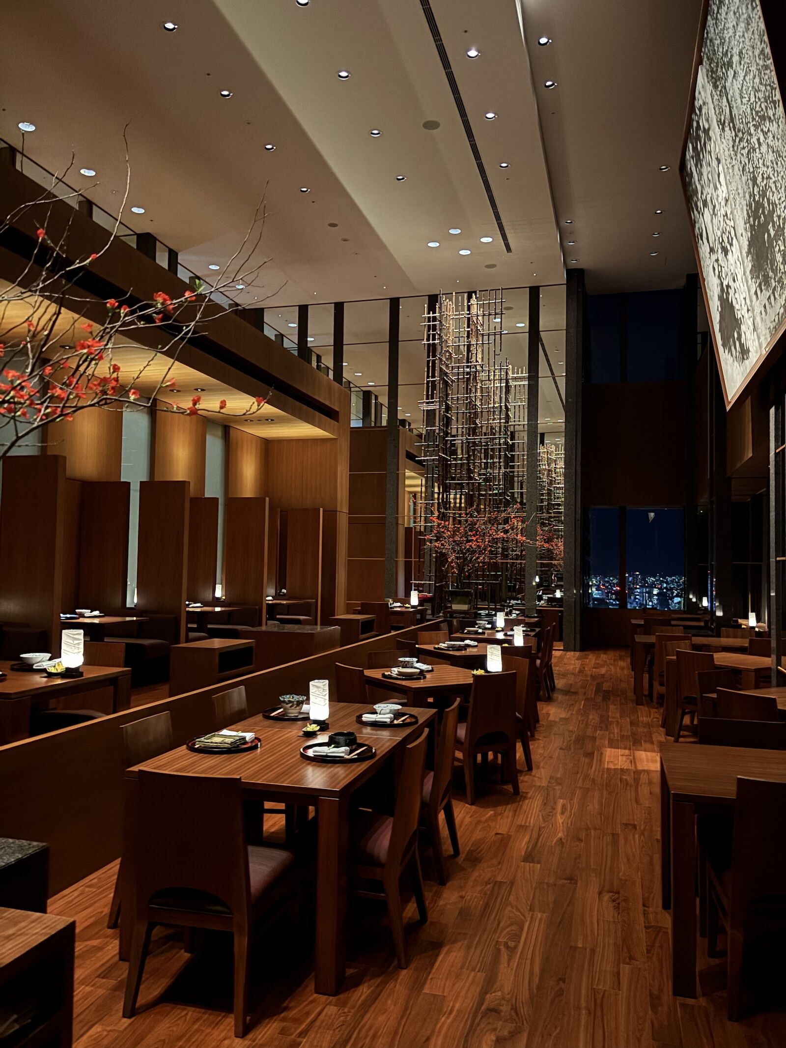 A proper first night in Tokyo should include a lot of seafood. As such, my wife, daughter, and I took a window-side table in Kozue shortly after checking in. The hotel’s upscale Kaiseki restaurant serves a set course of locally-sourced fish and flavors. Bamboo artworks by John Morford and the deep tones of Hinoki, a Japanese Cypress tree, set the tone for a meal that is iconically Japanese. We had the Raku course, launched by simmered abalone with sea urchin and headlined by steamed rice served in a clay pot with yellowtail and radish. My favorite dish in the course was the tuna, grouper, and sweet prawn sashimi, the tuna cubed to be bite-size and so fresh the raw bluefin maintained an aroma of the salty waters of its home in the Tsugaru Strait, between Japan’s main island of Honshu and the northern island of Hokkaido. The hot pot dish served with Japanese sirloin was a hit with my family as well, particularly with my four-year-old.