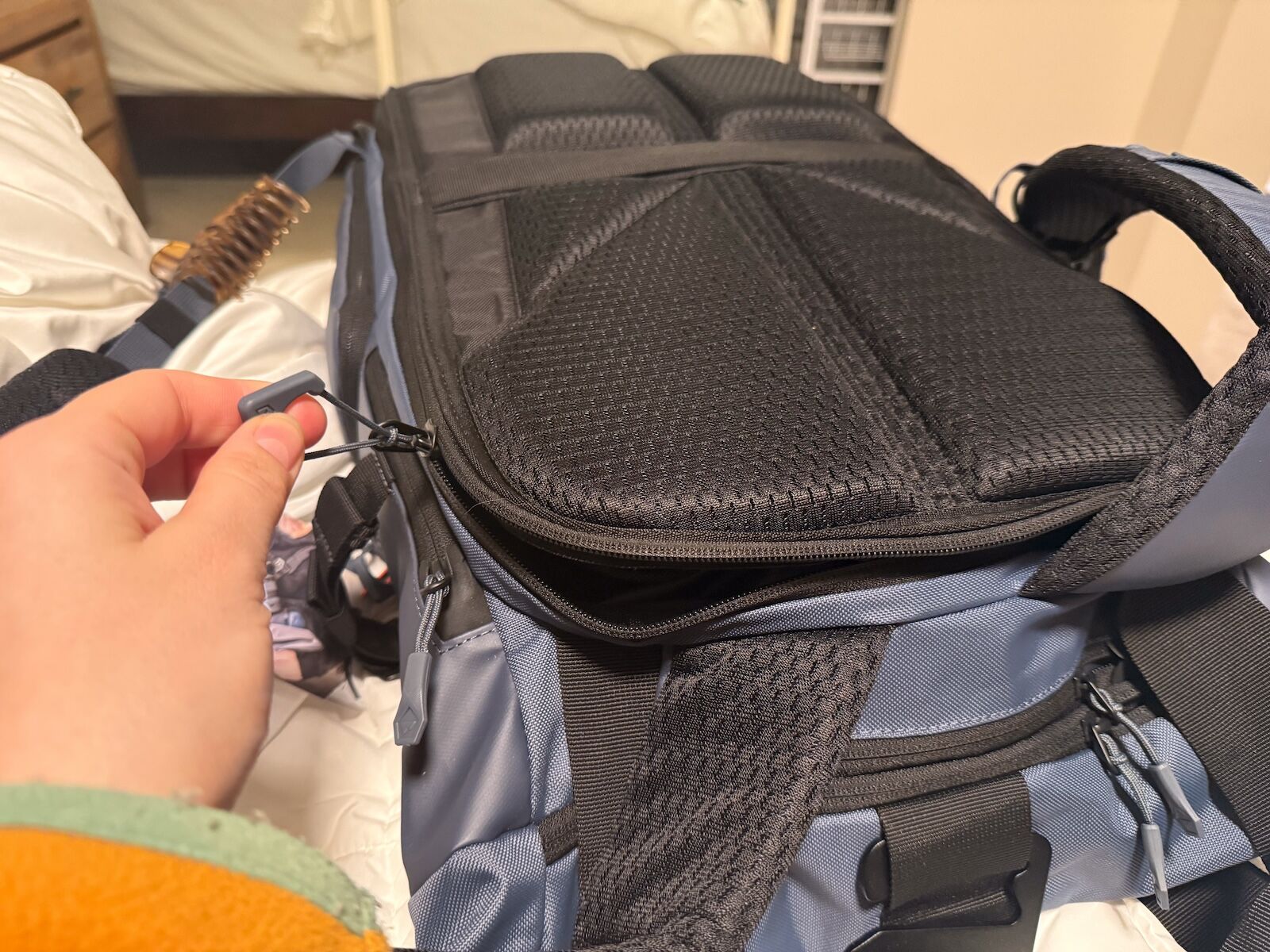 She has just one gripe that makes her prefer the older PRVKE to the new version. On the newest version (the V4), the backpack straps are above the clamshell zipper and hang down in front of it, so you have to push the straps to either side to fully unzip the back panel. On the older versions, the straps are attached to the back panel.