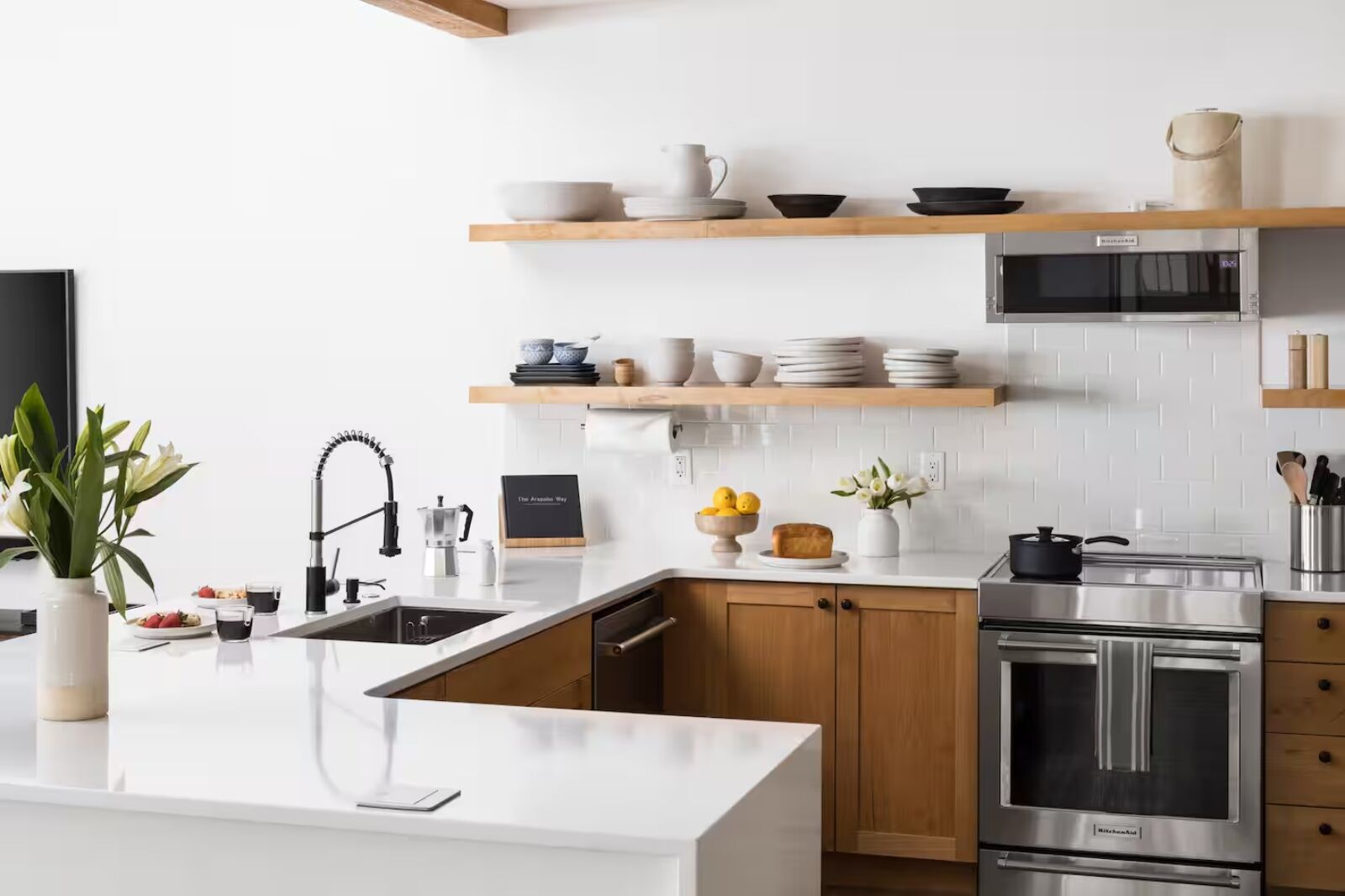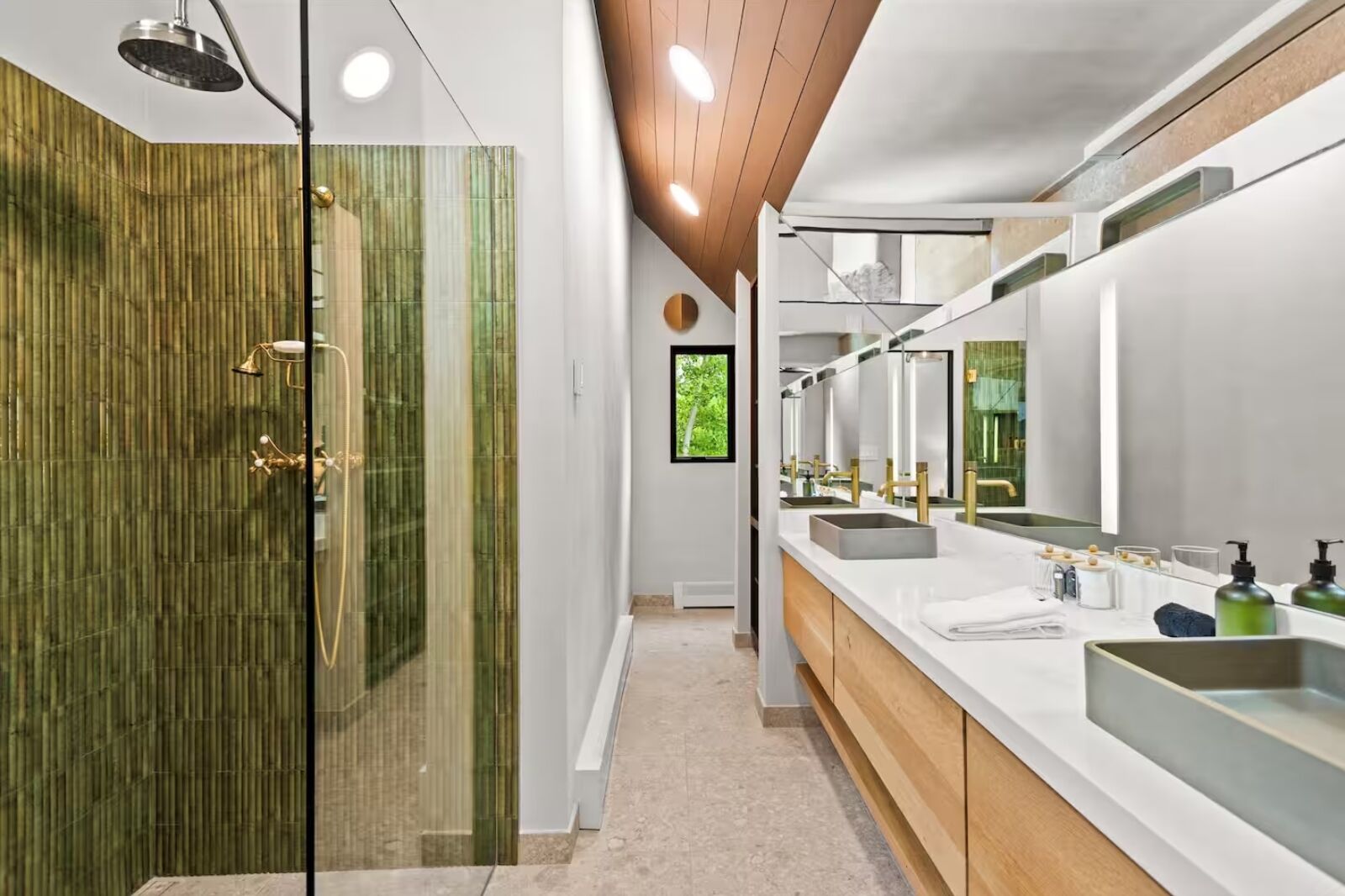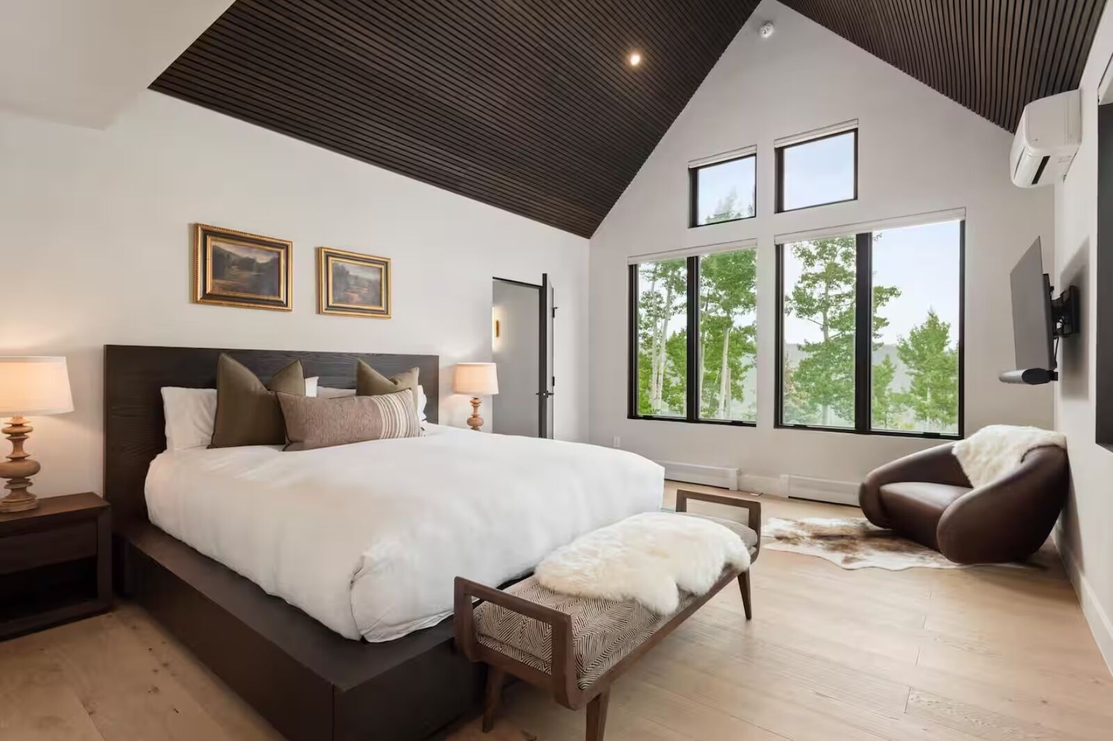 This rental is hosted by a property management company specializing in luxury vacation rentals in Park City. A stay here promises the best of both worlds: a quiet location — yet only minutes from the snow. It’s just over a mile to Deer Valley Resort and under two miles from Park City Mountain Resort, and the free shuttle service stops just a few steps from the front door. The four-bedroom home sleeps 10 and has an epic rooftop terrace with a hot tub and panoramic views (including a front-row seat to the happenings on Iron Mountain). There are also three huge outdoor decks, one with a grill and fire pit for après-ski hangs. The interior is open-concept, ideal for entertaining, and the kitchen is top-tier. All practicalities have been considered, including a mudroom and a secure two-car garage.
