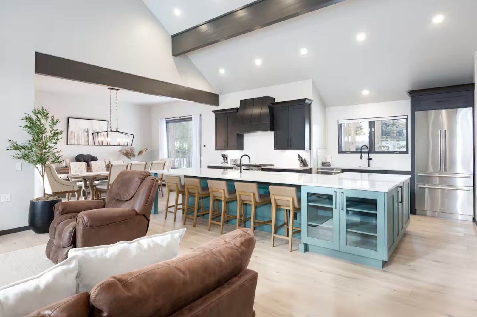 This custom-built chalet near Big Sky Resort has ski-out privileges and mountain views galore. It sits on its own lot on the outskirts of town, with a private hot tub and a ping pong table for everyone’s après needs. The interiors are top-notch, complete with a chef’s kitchen and a breakfast bar angled at Lone Peak. Elevate your stay by renting the host’s snow buggy — a fun and functional way to explore the area.