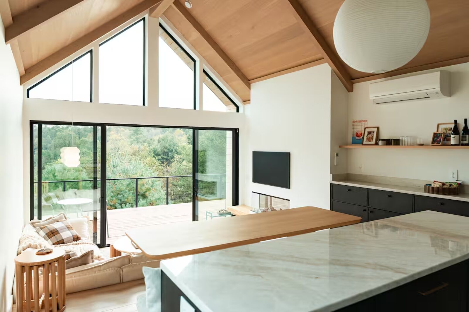 For a modern stay, check out this three-bedroom architect-designed luxe home. Perfect for a group, the Airbnb has an outdoor paradise with a heated pool, fireplaces, and a private putting green.
