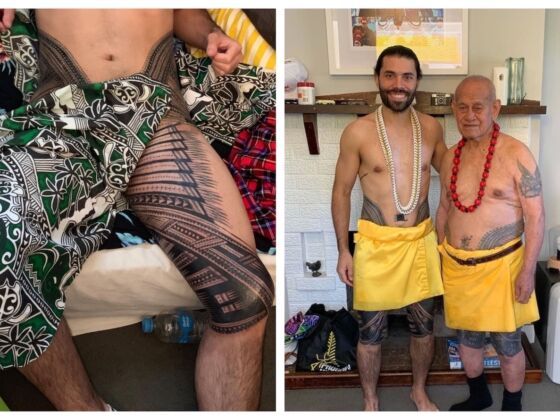 “The actual tattoo took 10 days from start to finish,” said Ta’ala. “The shortest day was six hours, and the longer days were around 10 hours. There are two people that just stretch the skin to the correct tension, shave, and wipe the blood. They had to do multiple cold showers and massage the tatau with soap to prevent infection. Traditionally in Samoa they’d use the ocean for this part but in New Zealand we did cold showers. In the old days many would die from infection when getting their Pe’a.”
