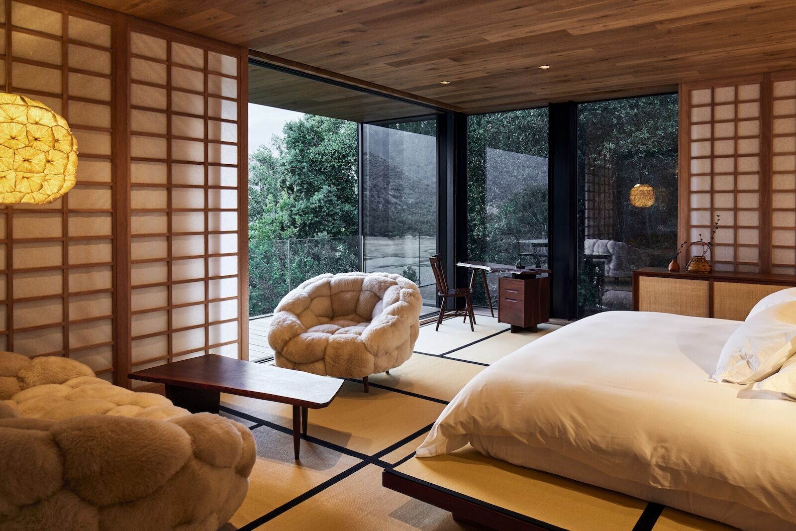 Beyond the rooms, the hotel’s “living room” is elegantly turned out with pieces from the owners’ art collection. On the lower level, you’ll find a games room as well as the hotel’s infinity pool which drifts above the wilderness.