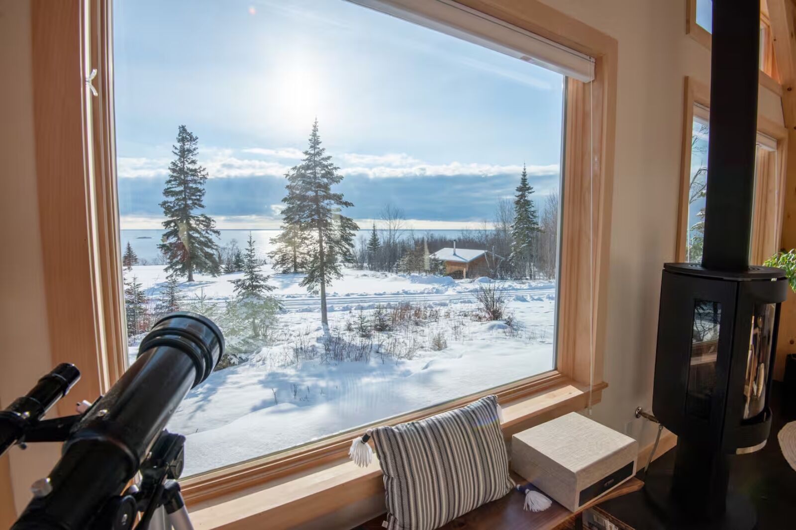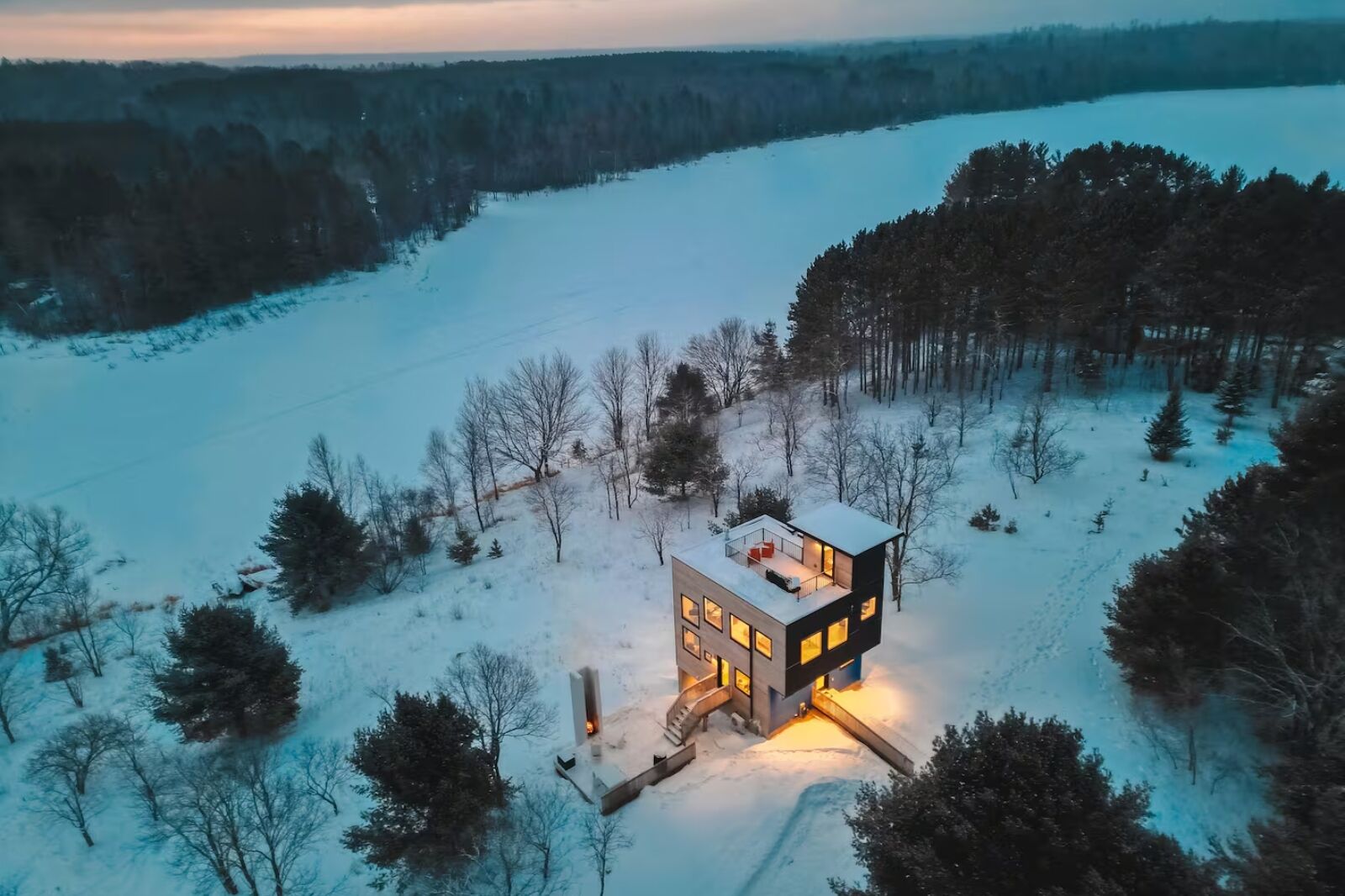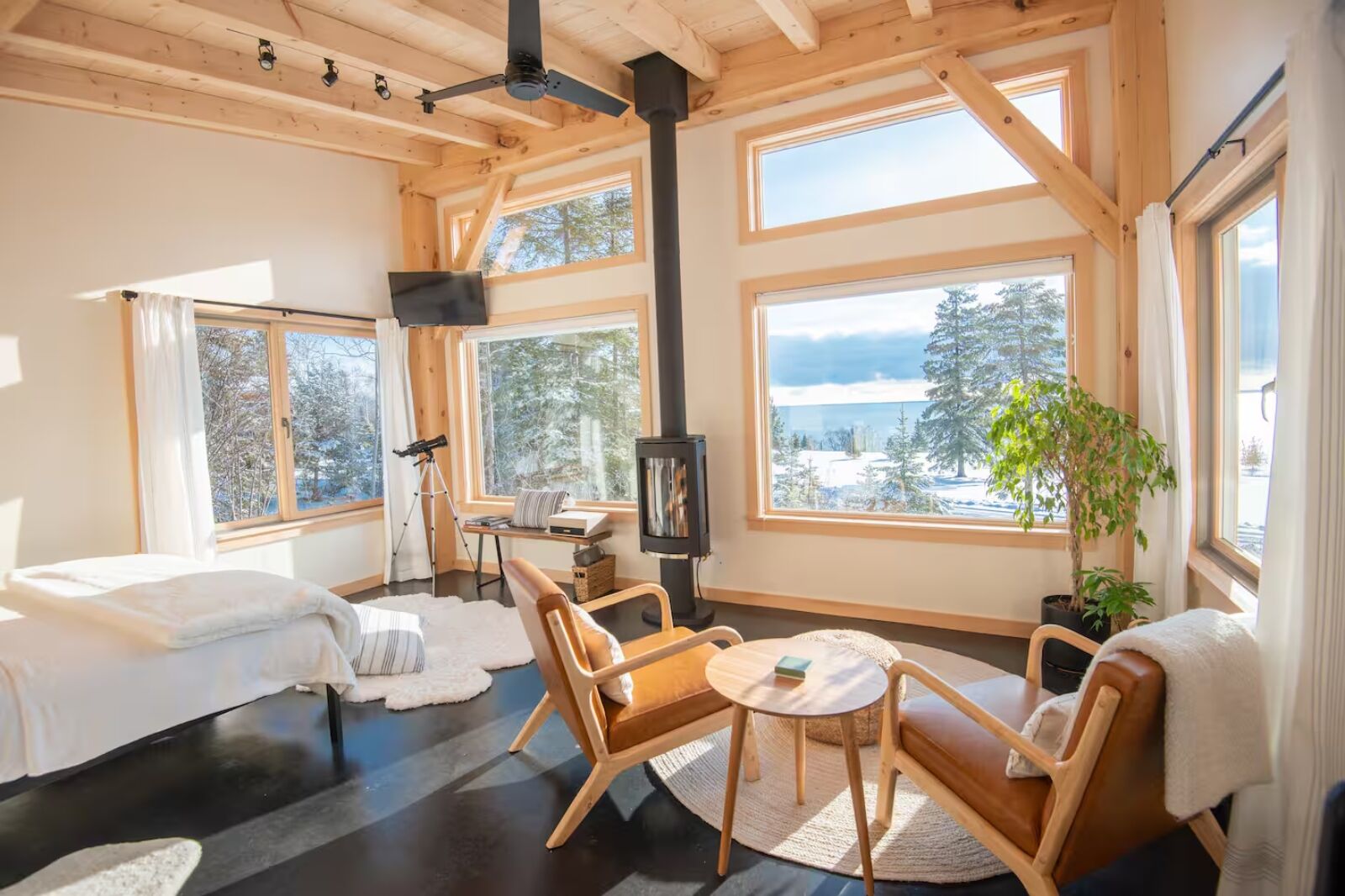 If your version of winter bliss is watching snow fall into Lake Superior with a mug in hand and no agenda, this spot will absolutely deliver. The sleek, minimalist cabin is perched high above the shoreline with views that make you forget your phone exists. It’s ideal for couples who want quiet, space, and a front-row seat to Minnesota’s icy drama. Grand Marais itself is small, artsy, and often covered in snow — and you’re right near the Gunflint Trail if you’re tempted by cross-country skiing or snowshoeing.