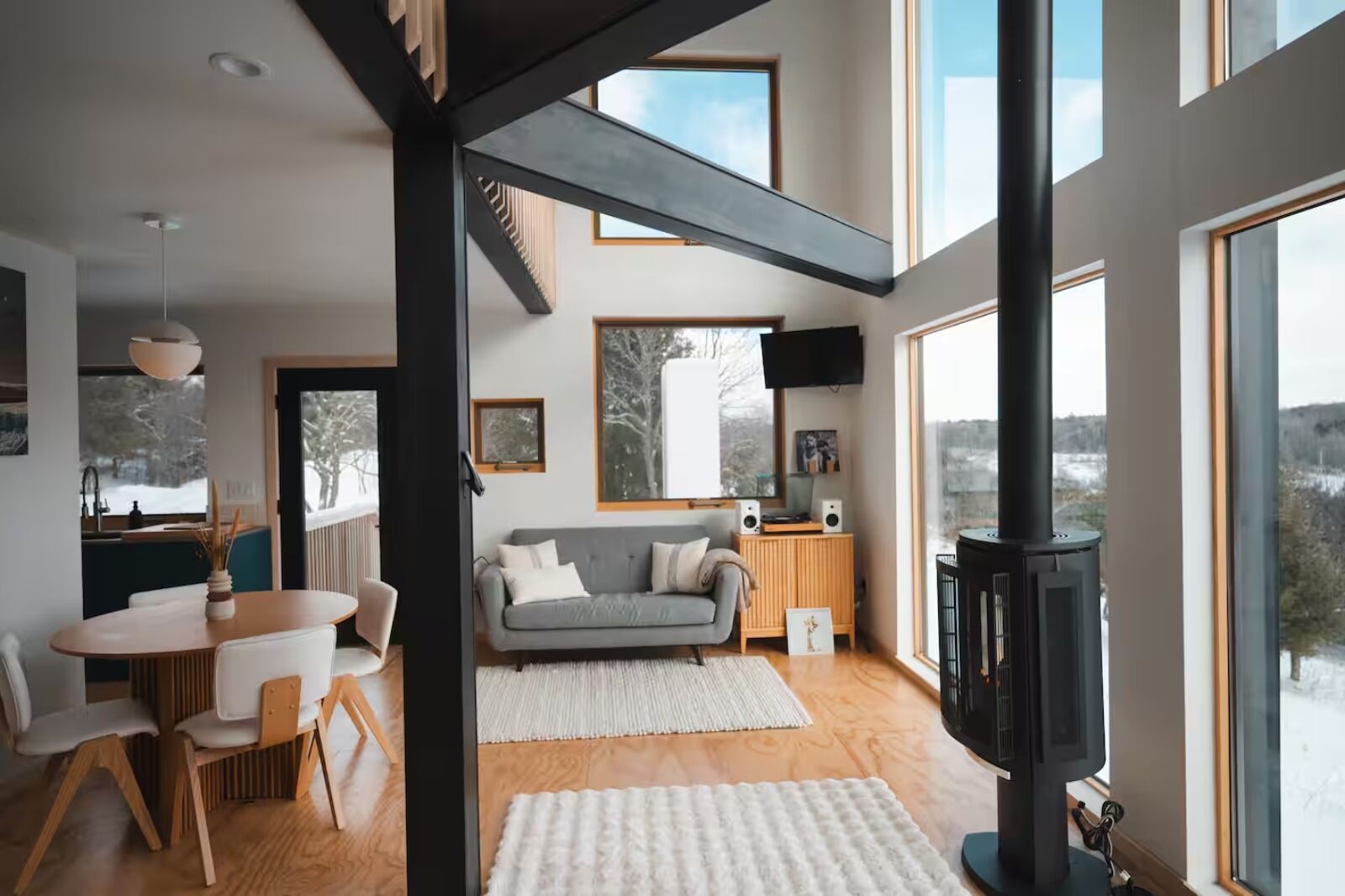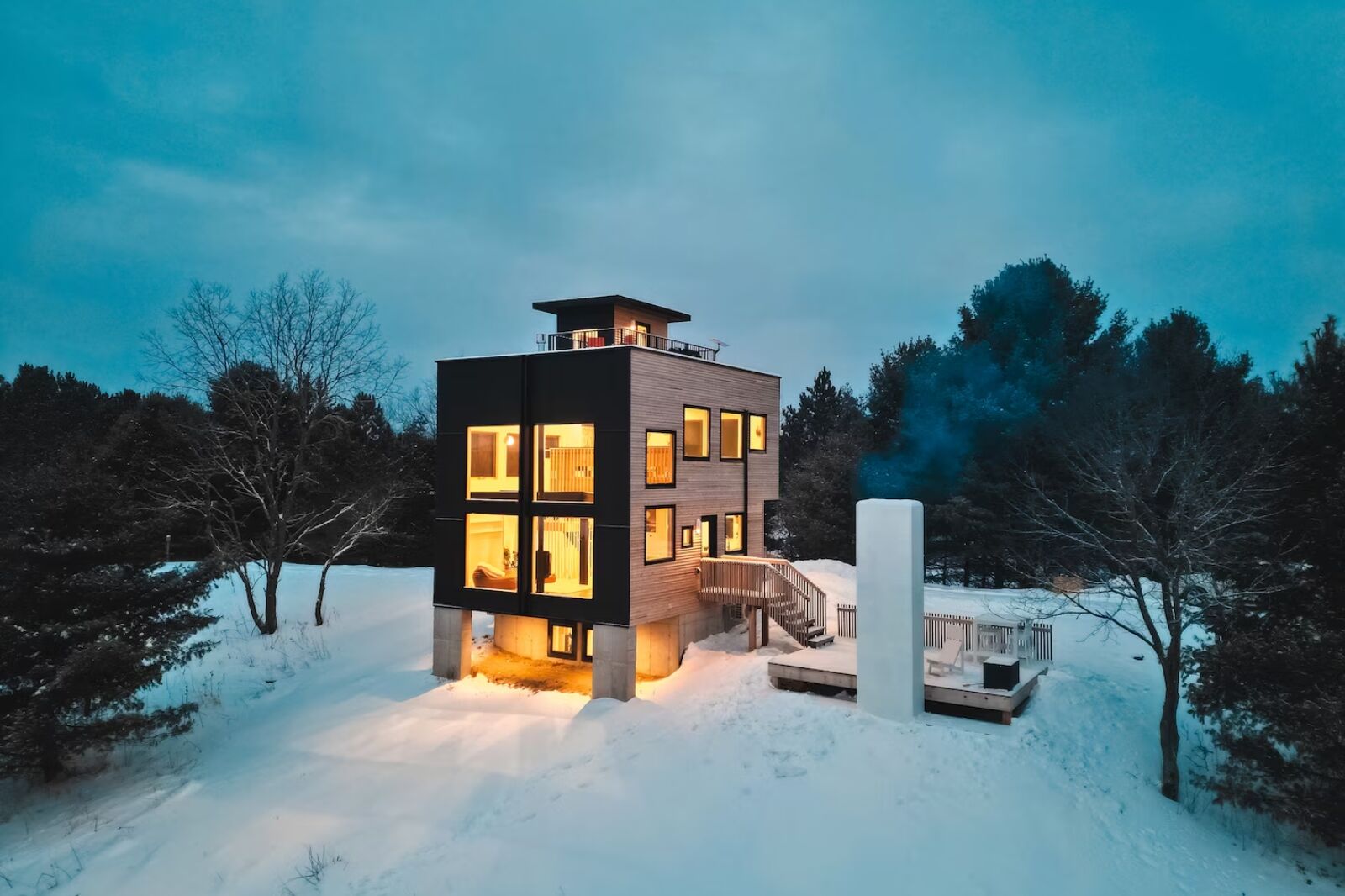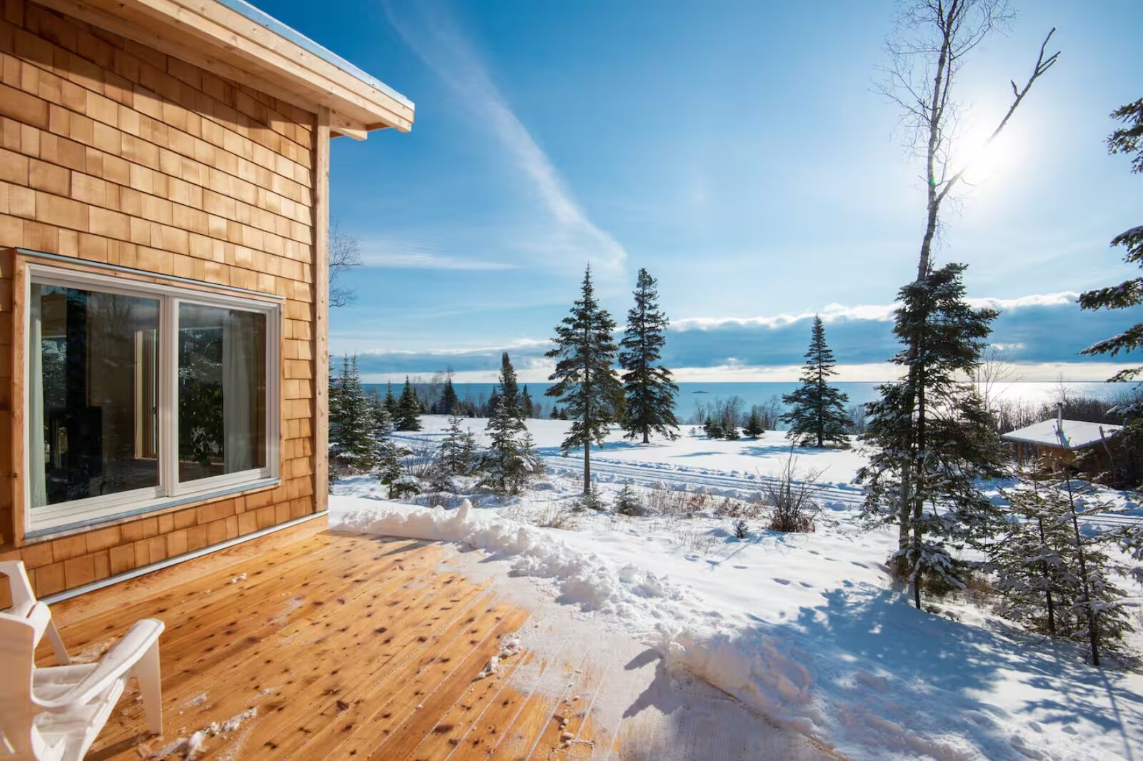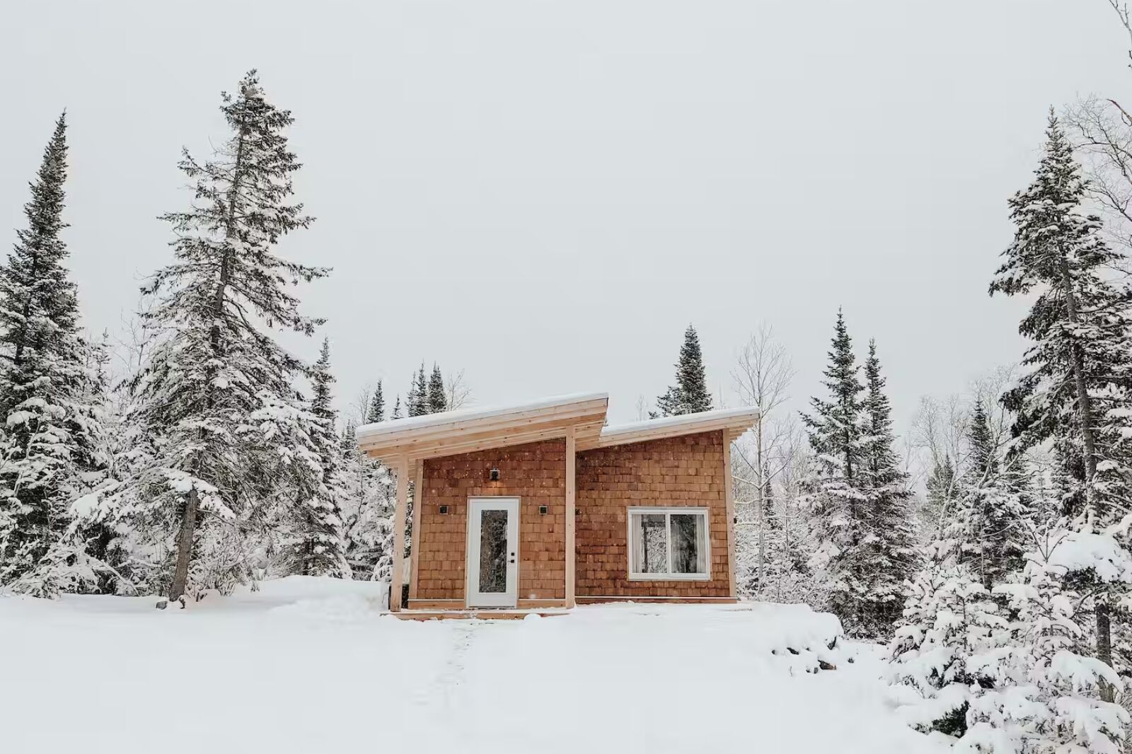 If your version of winter bliss is watching snow fall into Lake Superior with a mug in hand and no agenda, this spot will absolutely deliver. The sleek, minimalist cabin is perched high above the shoreline with views that make you forget your phone exists. It’s ideal for couples who want quiet, space, and a front-row seat to Minnesota’s icy drama. Grand Marais itself is small, artsy, and often covered in snow — and you’re right near the Gunflint Trail if you’re tempted by cross-country skiing or snowshoeing.